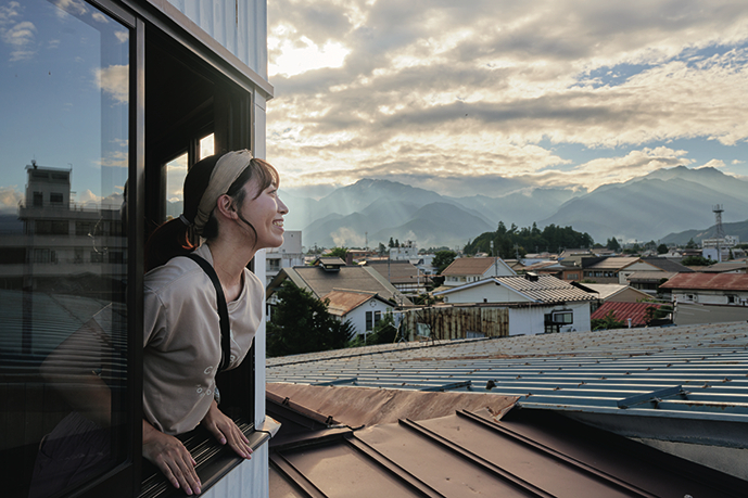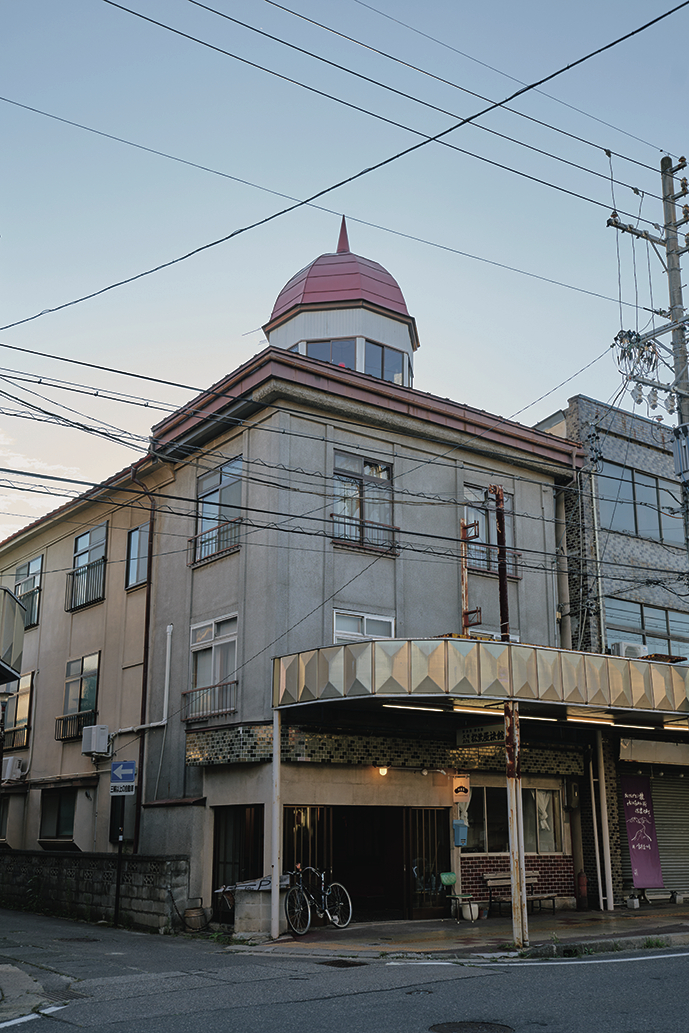 信濃大町駅から徒歩約9分。三俣山荘図書室の向かいにあるゲストハウス。とんがり屋根が目印。前身は大正8(1919)年建築の名旅館で、2025年7月に改装した。大正建築の意匠や、蔵出しの骨董・ランプを生かしてモダンに刷新。16:00~23:00は1階ラウンジがバーとなり、だれでも利用可。客室はドミトリーと個室から選べる。最上階「展望室 望楼」はアールデコ調のしつらえ。北アルプスと大町の街並みを一望できる。