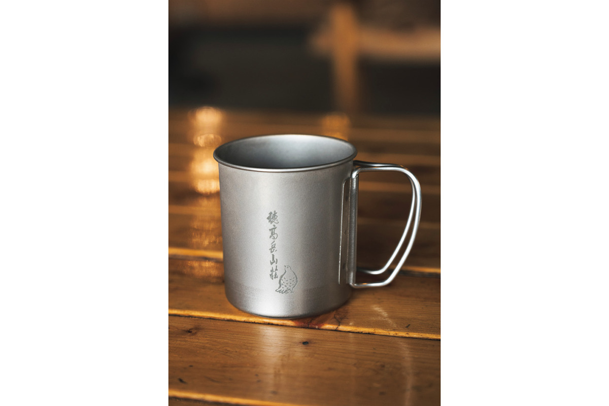 表面には山荘の看板とライチョウが、裏側には涸沢岳から奥穂高岳を見下ろす景色が刻印された「チタンマグカップ(2,800円)」。