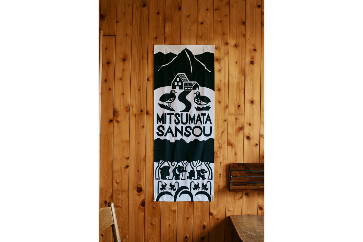 三俣山荘オリジナル手ぬぐい(2,000円 )。鷲羽岳やダケカンバの森、クマ、クルマユリなど、周辺に広がる自然の物語を描いている。