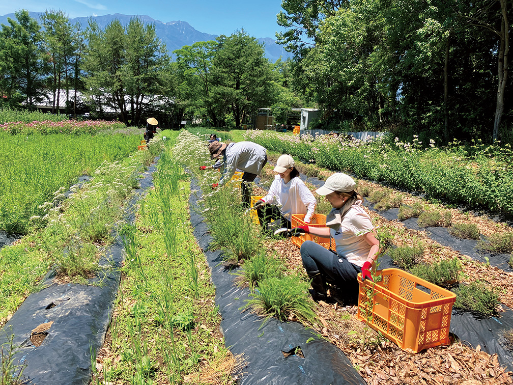 山口 社員には全員、入社してからできるだけ早い段階で「農場研修」を受講し、土づくりや雑草抜き、ハーブ収穫体験の機会を設けています。完成した製品だと、原材料となるハーブは写真や文字でしか表現されないので、製品にどのように作用しているのかが実感しにくいんですよね。研修では収穫したハーブの加工も行なっているので、社員も自分の手で工程に触れることにって、製品に対する理解や思い入れにも変化が出るようです。