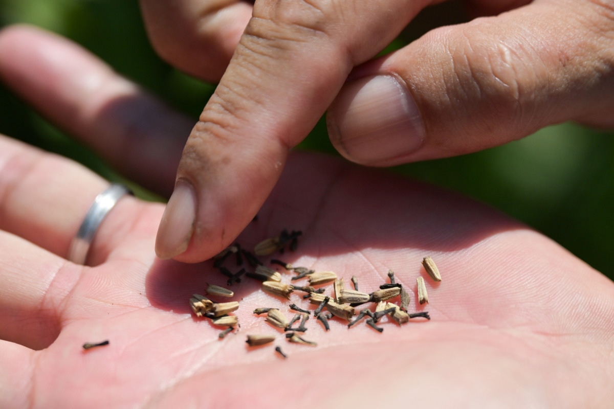 山口 いまの季節は雑草も勢いがあってどれがハーブだかわかりにくいですよね(笑)。季節の関係もあって全部が植えられているわけではないのですが、化粧品の成分として採用している9種類と栽培テスト中の植物が10数種類。この農場での栽培に適さないハーブもありますし、栽培が安定しない種類もあるので、取捨選択が難しいんですよね。