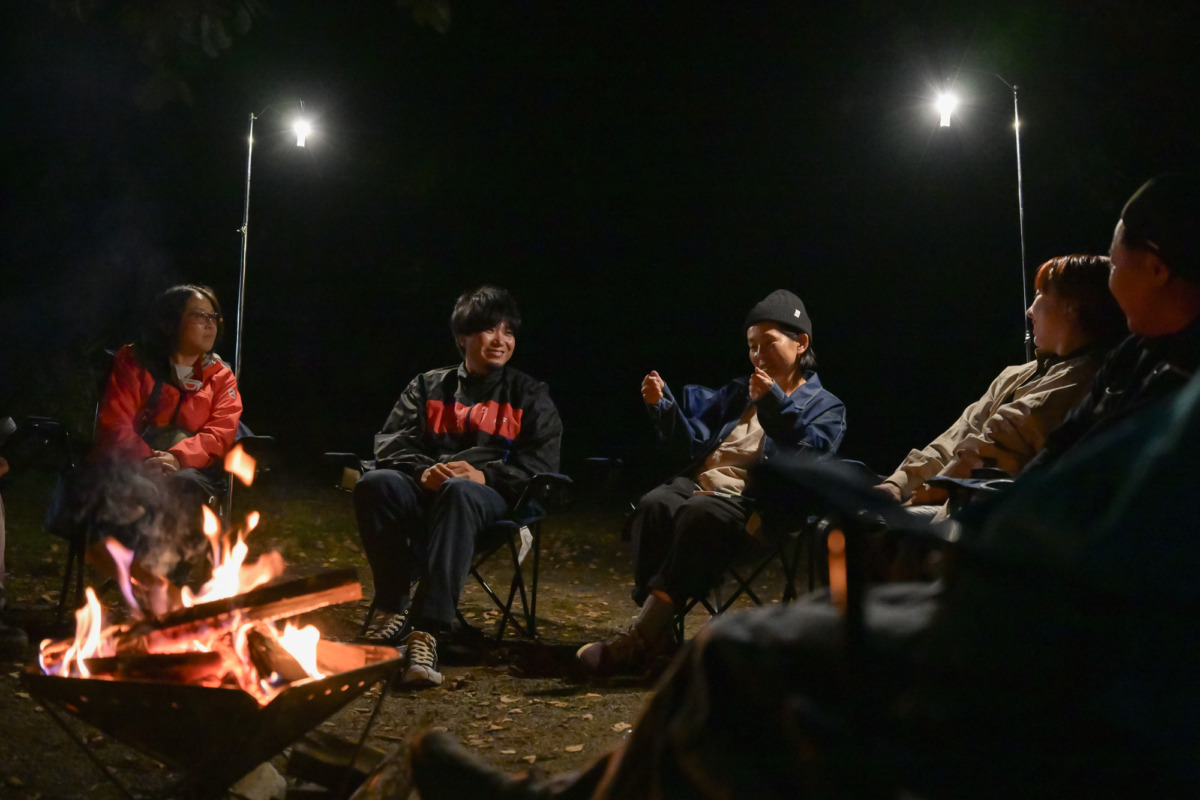 その後、ダムド代表・面髙翔五さんとランドネ編集長・あにやとのトークセッションが開始。焚き火を囲みながら、それぞれの“好き”を語り合う穏やかな時間が流れました。