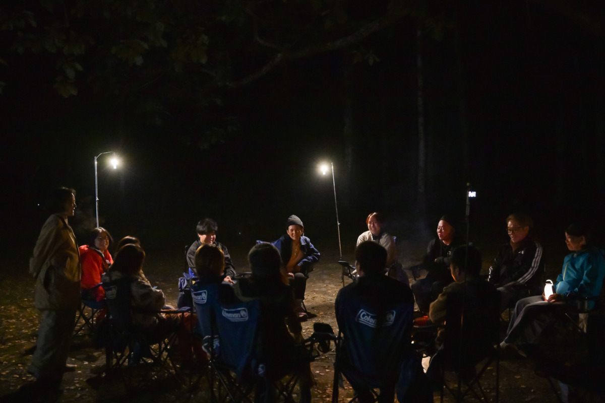 焚き火の灯りのもと、参加者それぞれが愛車と山のストーリーを語りました。