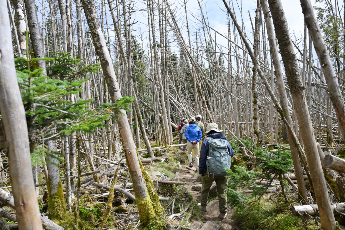 参加者は、ダムドユーザーチームとランドネチームに分かれてハイキングを開始。ガイドの佐藤玲奈さん、渡辺佐智さんの案内で、縞枯れ現象や、森を支える微生物や土壌など、自然の仕組みを学びながら歩きました。