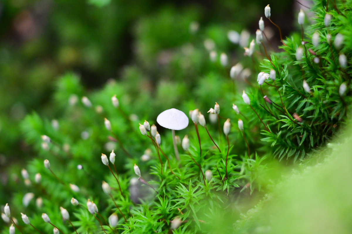 森に一歩足をふみ入れると、苔むした岩や小さなキノコ、コメツガの若木が出迎えてくれます。静かな森で、足音と風の音が響き、時間がゆっくり流れているようでした。