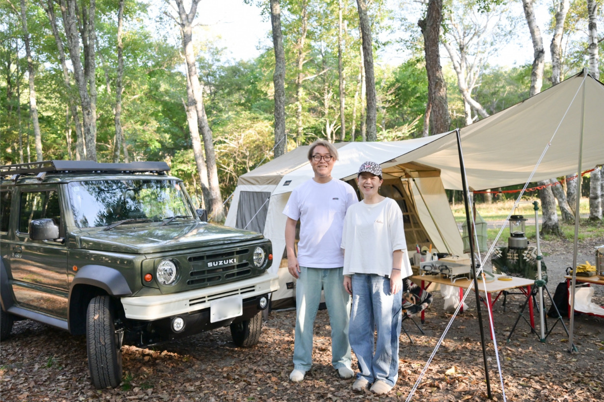 最近まで単身赴任で大分に住んでいた佐藤さんは、「阿蘇などを気持ちよく走りたいと思ってジムニーに乗りはじめた」と言います。ダムドのレトロなグリルに交換し、「すごくかわいくて、大満足」といっしょに参加した奥さまも笑顔。