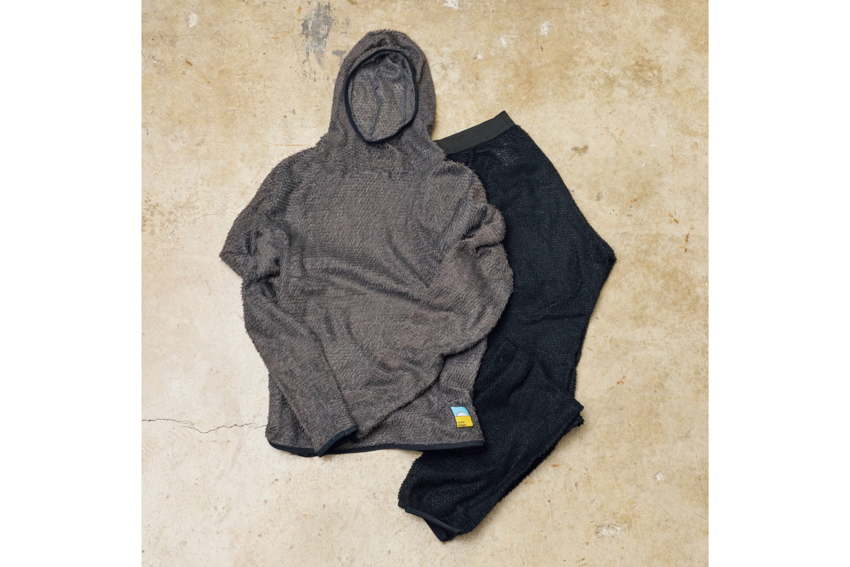 山小屋でリラックスしてすごすのに欠かせないのがアルファダイレクト素材のフーディ&パンツ。山行とは別のウエアに着替えることで、疲れをリセットする役割もある。