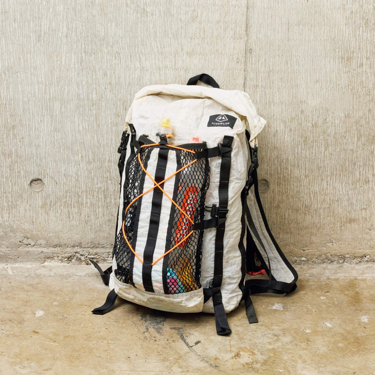 重量わずか360g。山小屋泊など荷物が少ないときは軽やかに歩けるようにバックパックも軽量に。オプションでカスタムしたフロントの大きなメッシュポケットが使いやすい。