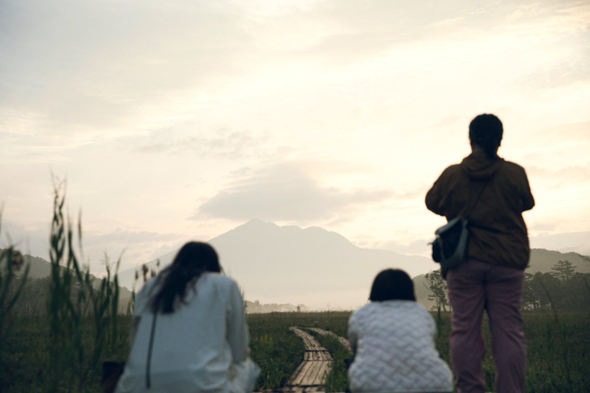 2日目の朝。日の出を迎えるころ、山小屋のスリッパを履いて尾瀬ヶ原に延びる木道を進んでいきます。空は少しずつ明るくなり、浮かび上がる燧ヶ岳の姿。静かに“その瞬間”を待つことは、この場所に泊まった人だけが味わえる時間です。