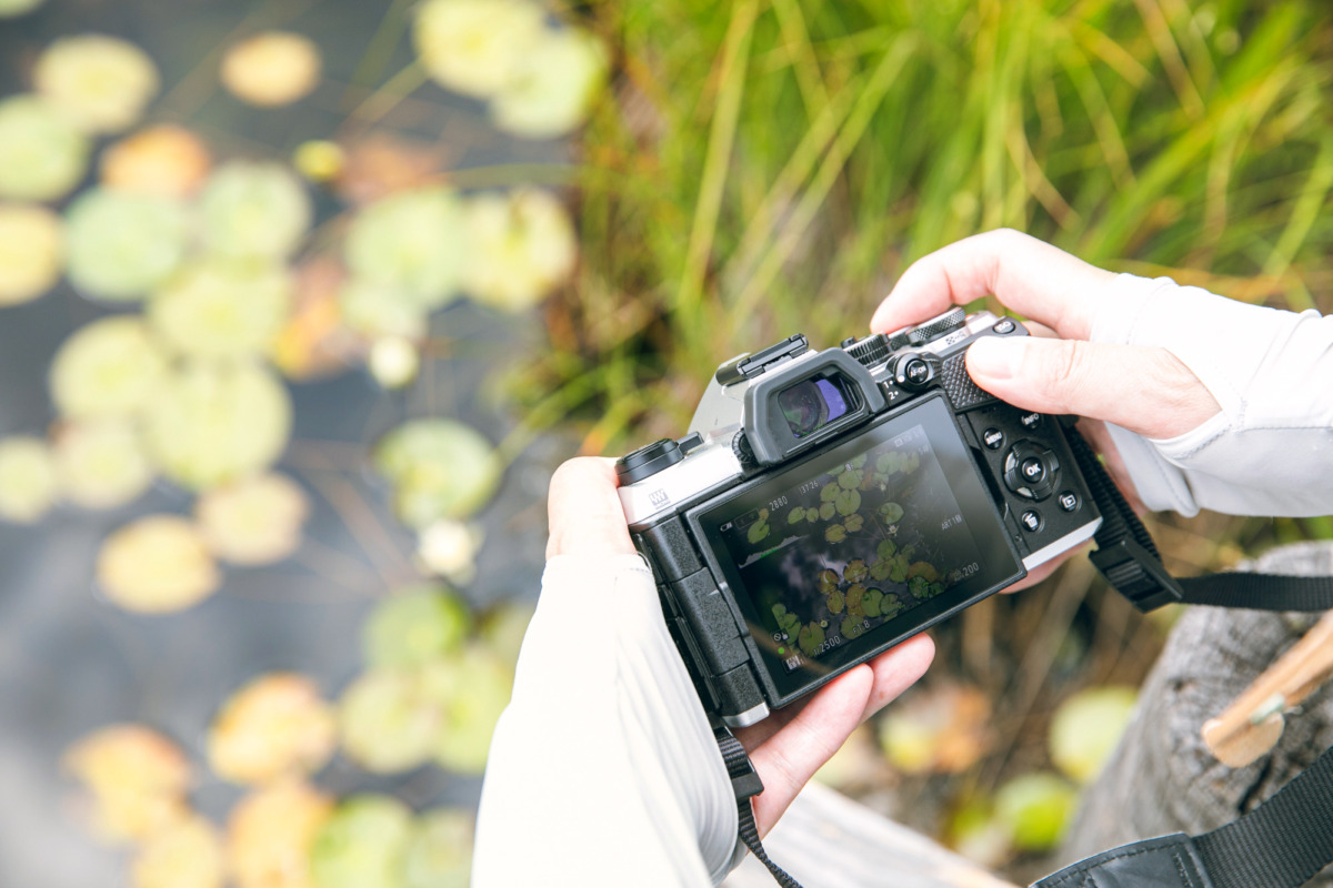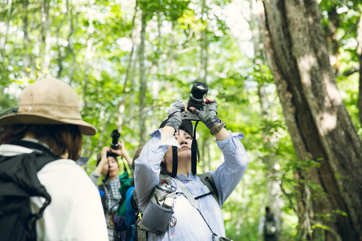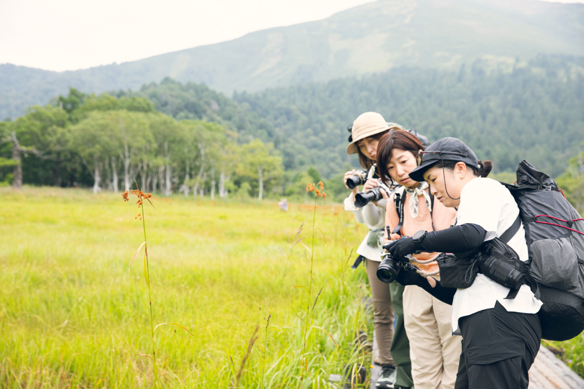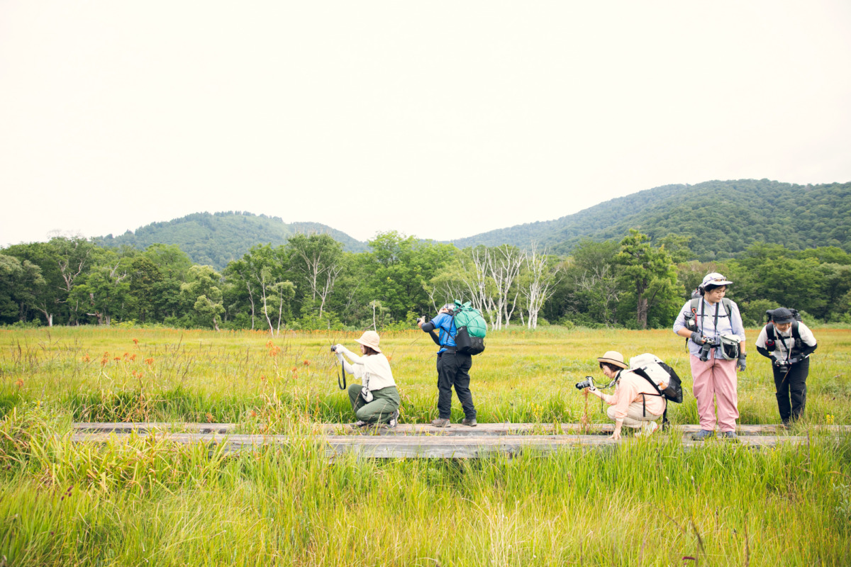 平日ともありハイカーの数もまばら。一歩、一歩、前に進んでは、撮りたい植物や風景を見つけて立ち止まり、カメラを構えてシャッターを切る。もっとこう撮りたい、ああ撮りたいと悩み、川野さんにアドバイスをもらいながら、もう一度シャッターを切り、一歩ずつ前へ。そんなふうにくり返しながら、尾瀬ヶ原の自然とじっくりと向き合う時間がすぎていきます。