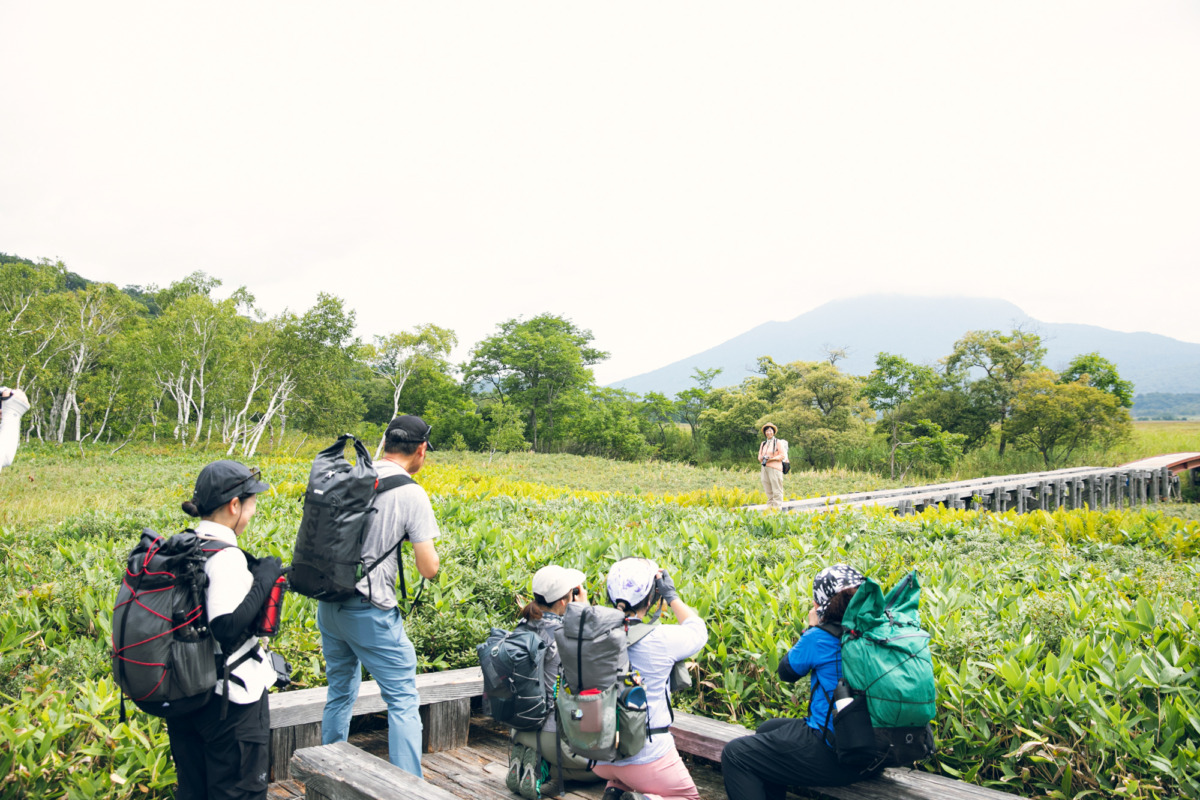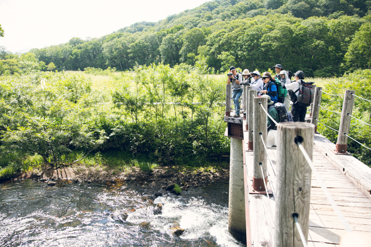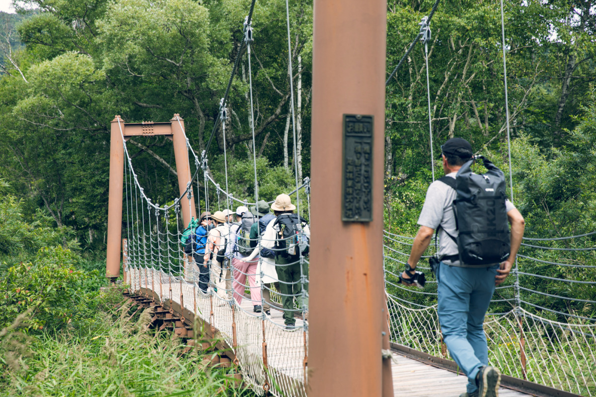 お昼休憩をとった龍宮小屋を出発したのは12時ごろ。少し遠回りをして、ヨッピ橋、東電小屋を経由して、見晴を目指すルートへ。ここから先は、木漏れ日の差す森のなかや、川の流れが撮影できる大きな橋など、広々とした湿原とは異なる撮影スポットが点在しています。