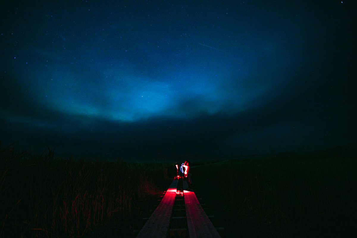 基本的な星空の撮り方を教えてもらったあとは、頭上に一切さえぎるものがない尾瀬ヶ原の木道の上へ。雲の隙間から見え隠れする星。しばらくすると雲は流れ、満天の星が広がります。三脚を立てて、それぞれが静かに楽しむ星空撮影。「すごい!」「こんなにキレイに星が撮れたのは初めて」などの声が上がり、最高のごほうびタイムとなりました。