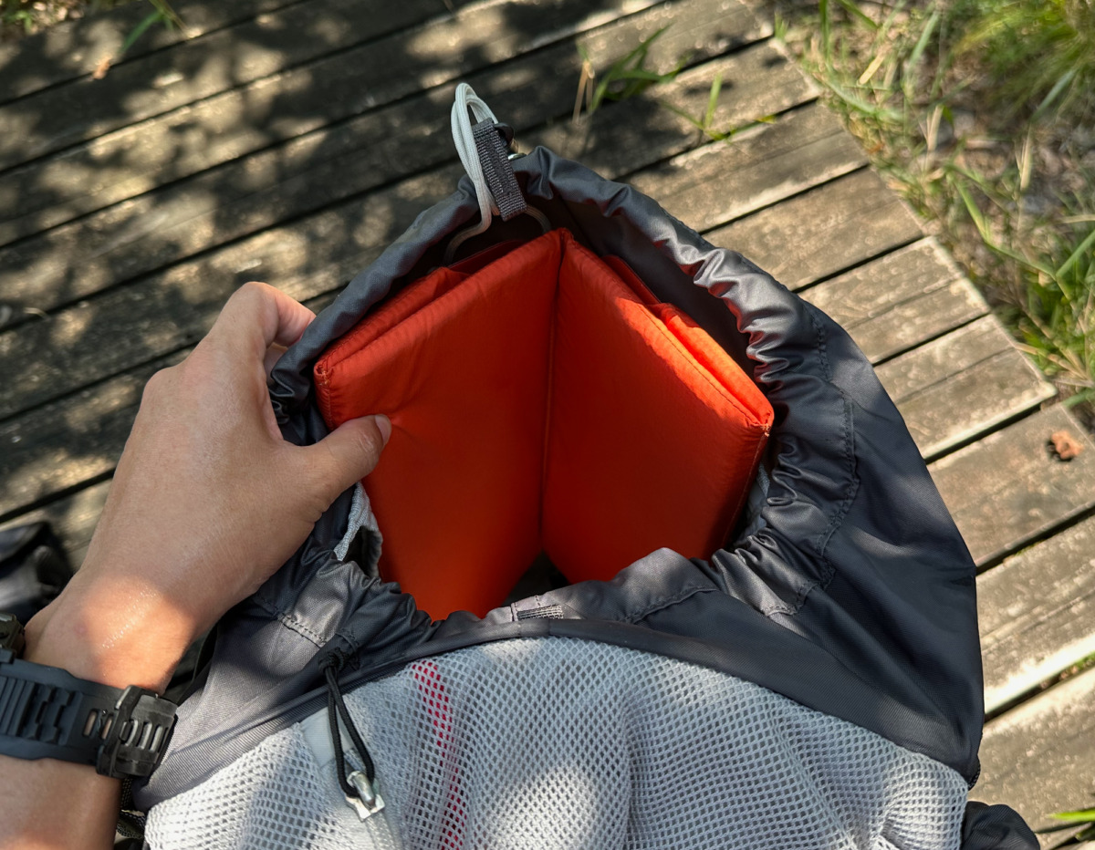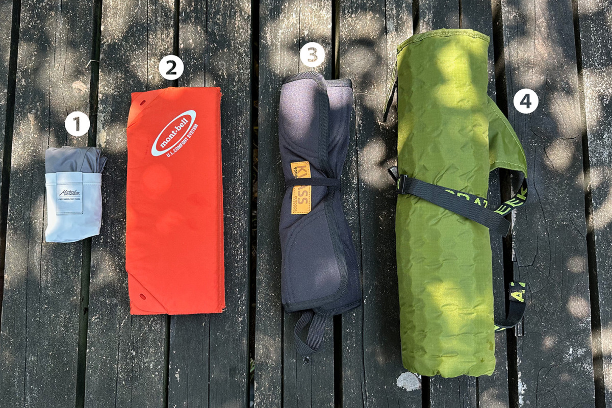 次に四隅にペグや石を入れるポケットが縫い付けられたマタドールのポケットブランケット(1)。折る順番がプリントされ、簡単にコンパクトに収納できます。次に定番となるクッション材が入った折りたたみ式の座布団(2)。ゴツゴツとした岩の上でも、冬の冷えたベンチでも柔らかく暖かく座ることができます。座る以外の使い方として、背面のクッション材が少ないバックパックの背中に使用したり、パッキングの形を整えるために荷室に壁のように収納したり、またケガをしたときの当て木として使用できます。