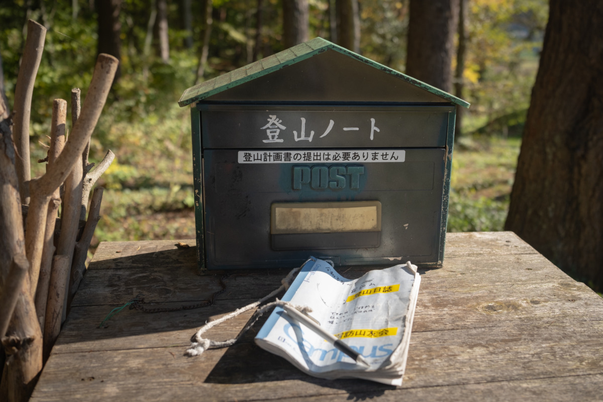 あっという間に登山口に着くと、朝は気づかなかったポストがありました。登山届かと思いきや「登山ノート」と書いてあるではありませんか。ページをめくるとたくさんの人が霧訪山の思い出を書き綴っていて、この山がいかに愛されているか分かります。残り少ないページの端に私もこっそり書き残しておくことにしました。