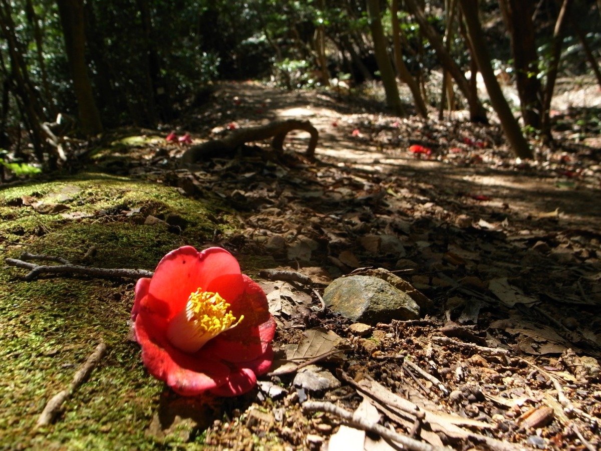 奥の院から山頂までは気持ちのいい森林浴。足元の枯葉のなかに鮮やかな赤が混じり、顔を上げると立派な椿。冬の赤ってひときわ艶やかで美しいですね。