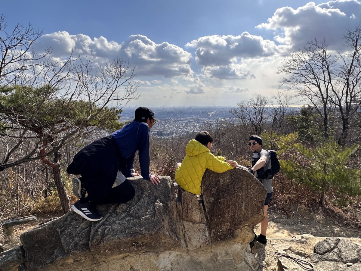 すれ違うハイカーさんたちと「こんにちは!」のごあいさつ。シャイな子どもたちですが、山のあいさつは小さいときからの習慣だからか自然と出てきます。しばらく登ると「恐竜岩」に到着。本当の名前は「夫婦岩園地」。恐竜っぽい岩があるので子どもたちが名付けたお気に入りのスポット。天気がよければここから大阪平野を一望できます。