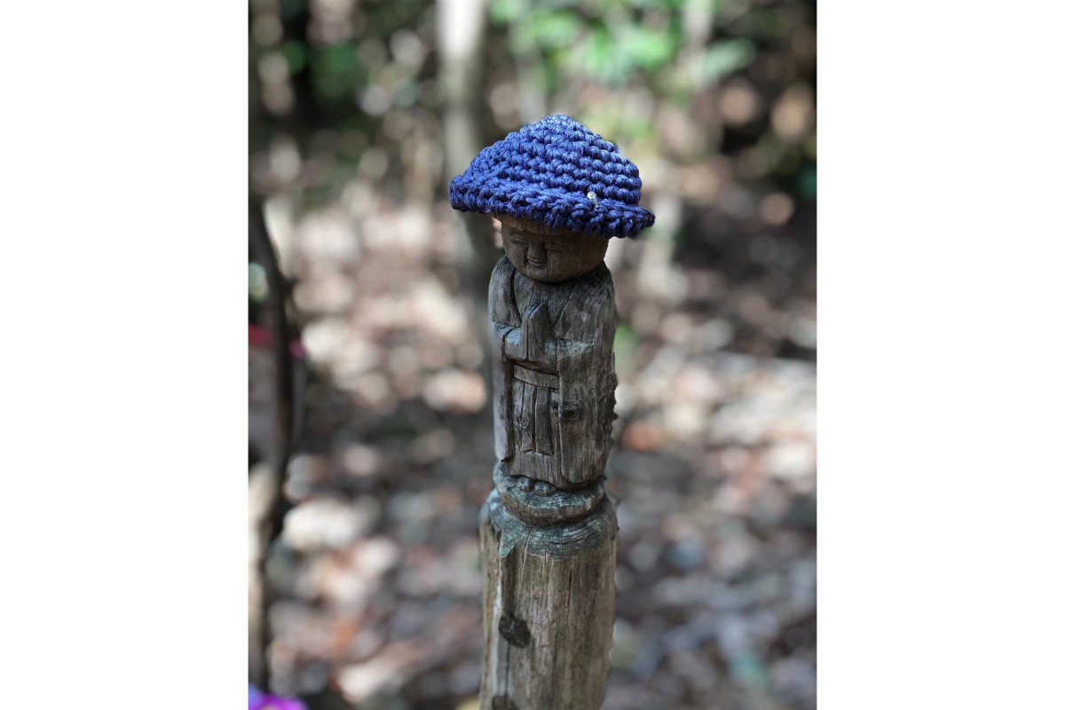 真冬とはいえ登っていると汗をかくので、きりっと冷えた空気が心地よい。おやつで一服して奥の院を目指します。奥の院までは参拝の方も多く、整備された石段が続きます。ところどころ毛糸の帽子を被ったお地蔵さんがおられてかわいらしい。子どもたちと学校の話や友だちの話、いままでに行った山の話をしながらのんびりと。家族でゆっくり話ができるのも登山の良いところ……と思っていたら、斜度がゆるむと走り出す人たち。置いていかれる私。