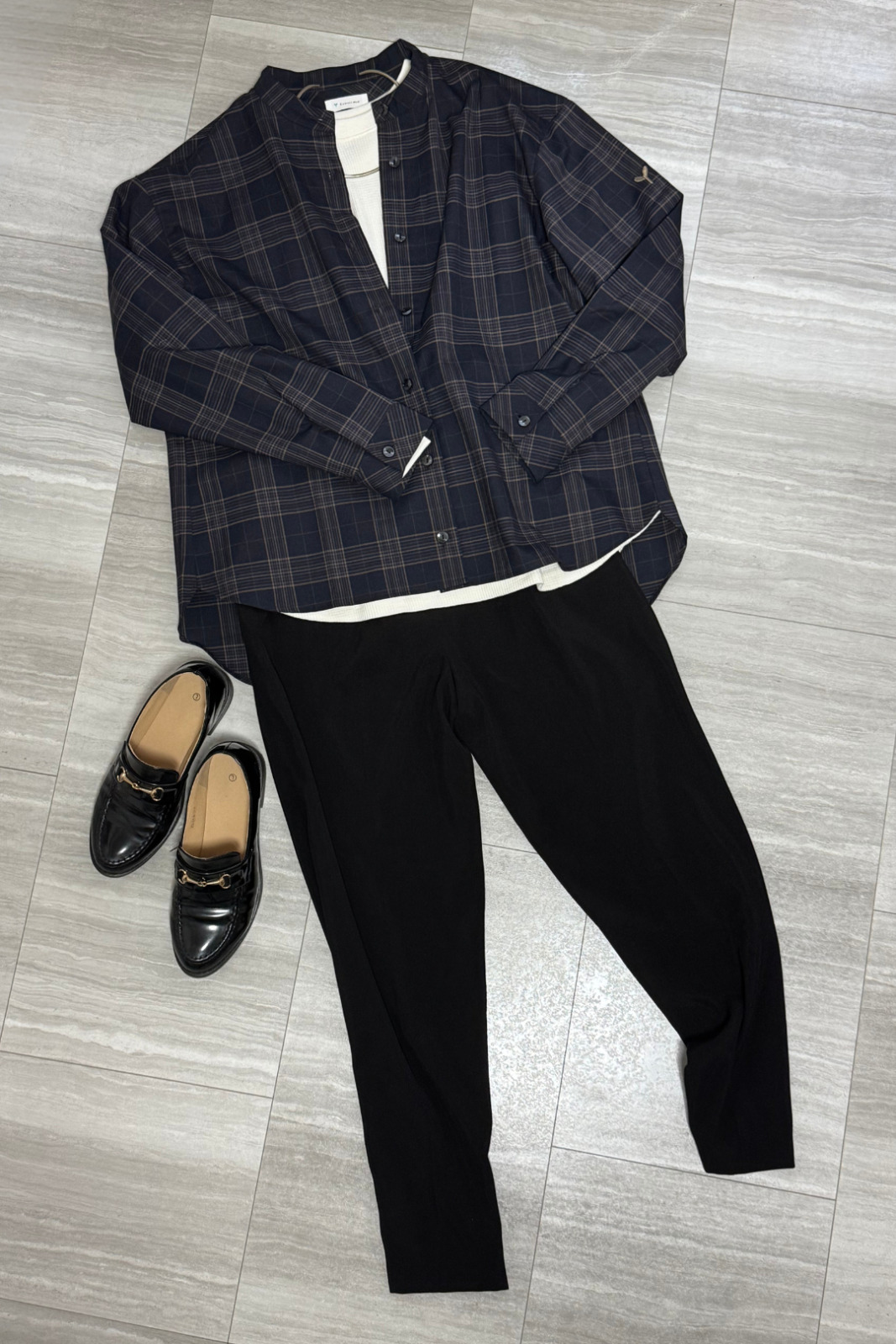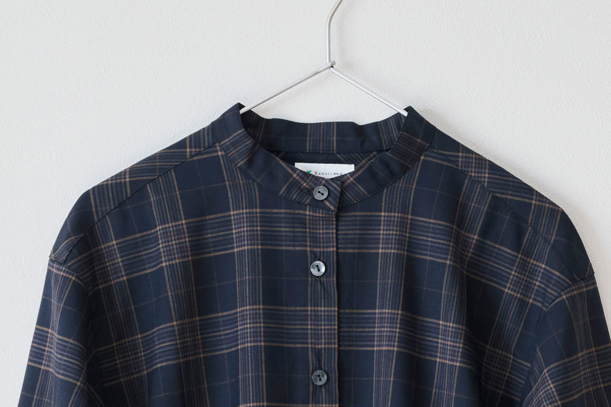 襟のないバンドカラーは、顔まわりをすっきり見せてくれて、タートルネックやストールとも好相性。コーデの幅を広げてくれる存在です。