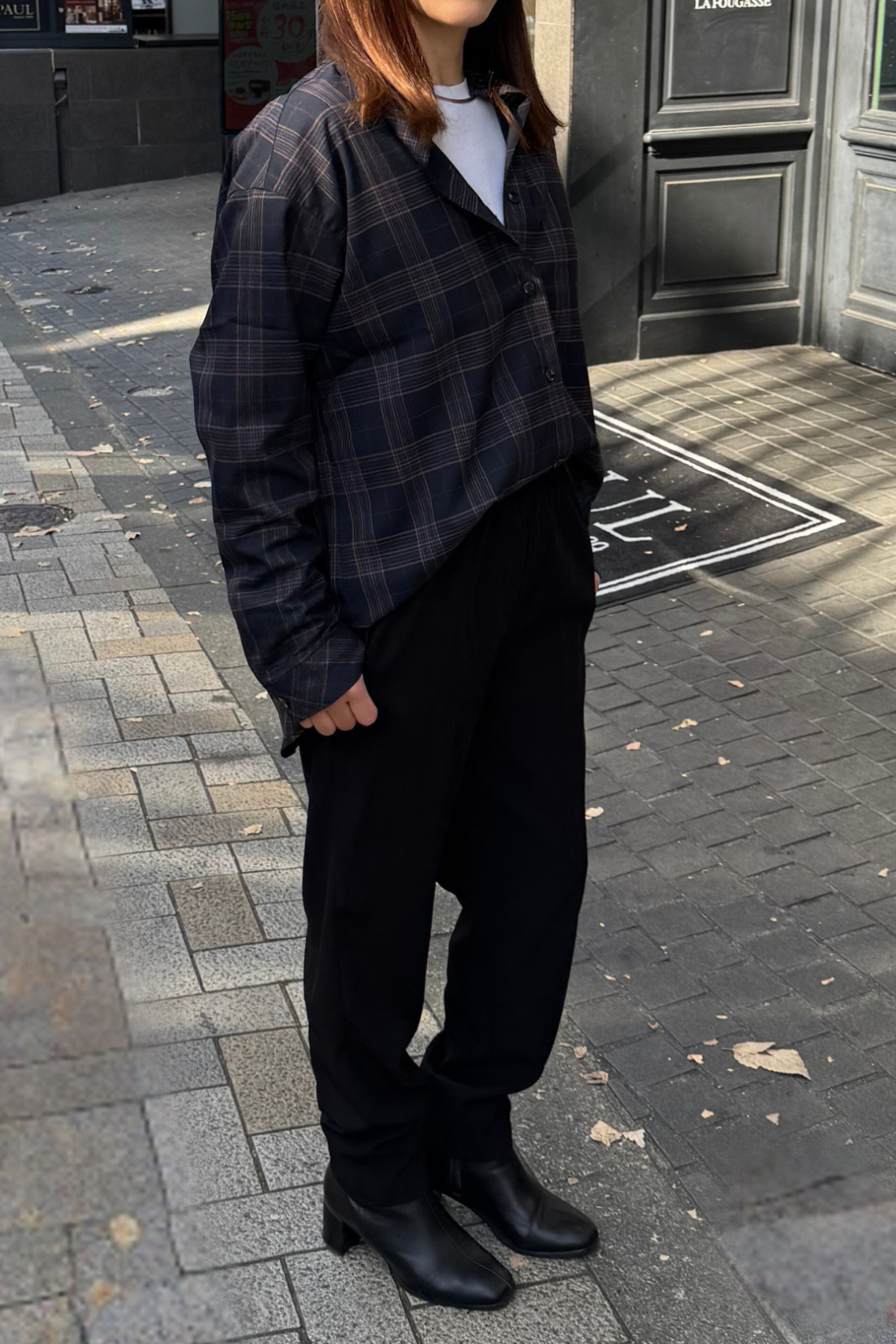 レーヨン・ポリエステル・ウールをブレンドした生地は中厚手ながら、動きに寄り添うしなやかさがあります。 ほどよいハリと落ち感があり、季節の変わり目にも心強い素材感です。