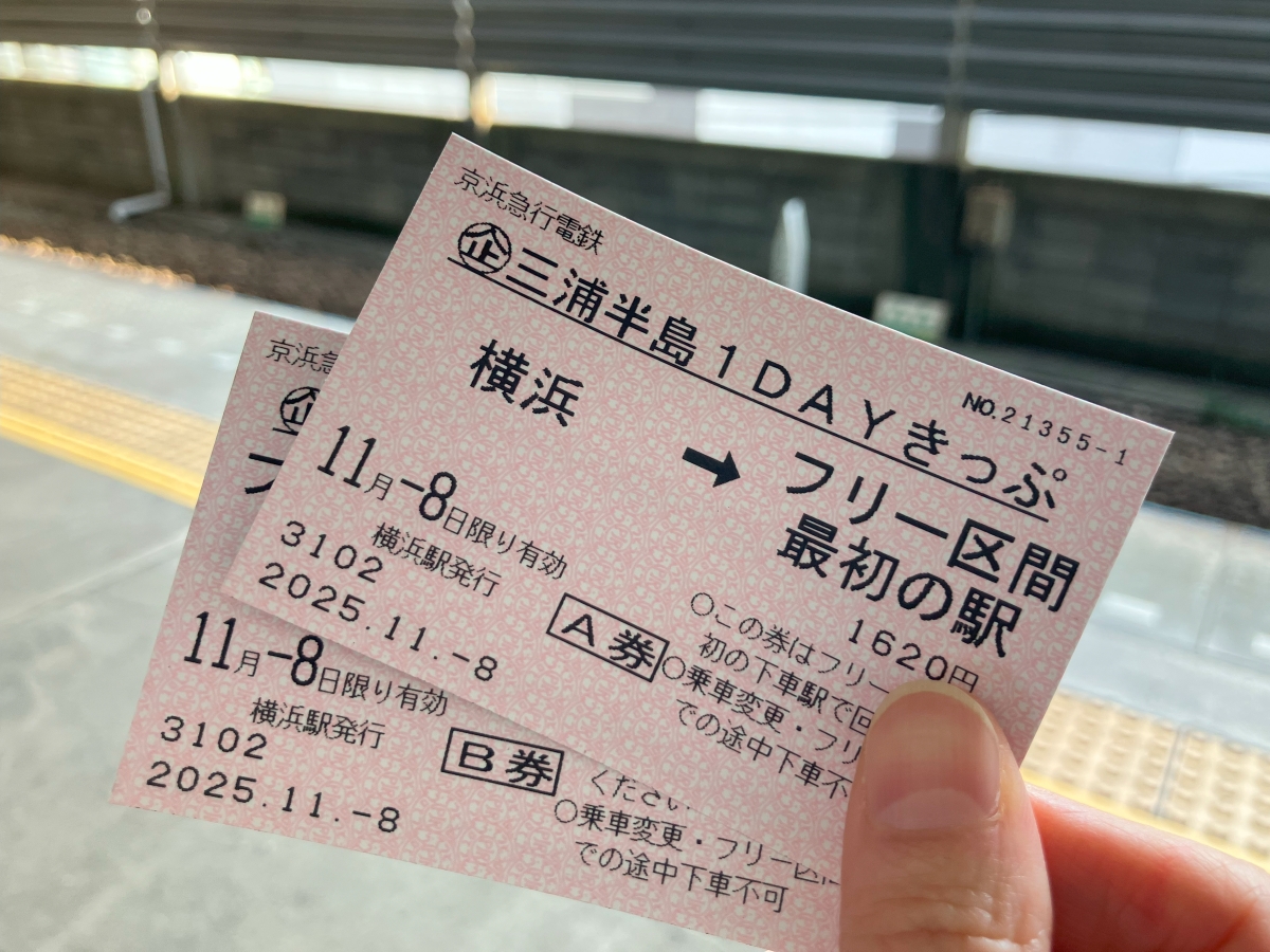 今回選んだのは、JR衣笠駅から京急長沢駅まで、衣笠山・武山・砲台山・三浦富士の4つを歩くコース。下山後に観音崎へ向かうことを考え、春に訪れたときに気になった、電車とバスが乗り放題の「三浦半島1DAYきっぷ」を使うことにしました。
