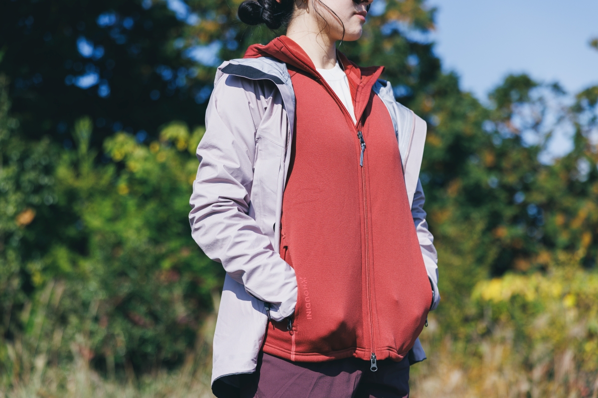 低山をつないで日帰りで歩くプチ縦走では、アップダウンがあったり、木の根や岩場を上ったりする道があることも多い。そのため、足や腕がいつでもストレスなく動かせる、ストレッチ性に優れたウエアを重ねてコーディネートするのがおすすめ。カラーは同系色でまとめてグラデーションを楽しむと、大人っぽい印象に。