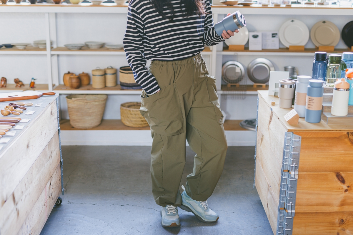 ポリエステル100%素材のワイドシルエットパンツは、大小7個のポケットを配したサコッシュいらずのアイテム。外側のポケットには、スマホやお財布のほか、500mℓのボトルもすっぽり。Tシャツはパンツにインすることでバランスがよく、シューズによって裾を絞って履くと◎。