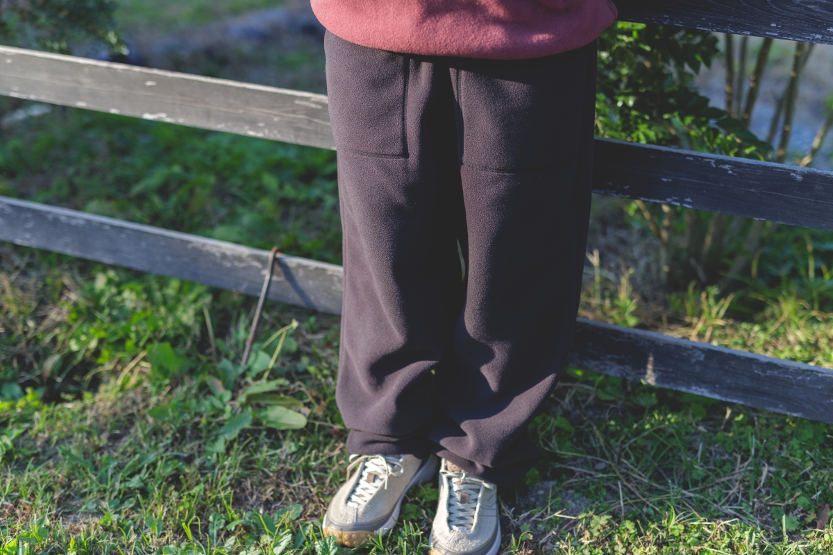 高い保温性をもつポーラテックのフリース素材のパンツは、キャンプでのリラック用としてはもちろん、通気性に優れ蒸れにくいため、自然散策やハイキングに着用することも可能。柔らかく履き心地はバツグン。インナーにタイツを履いてレイヤリングすれば、より機能的に。