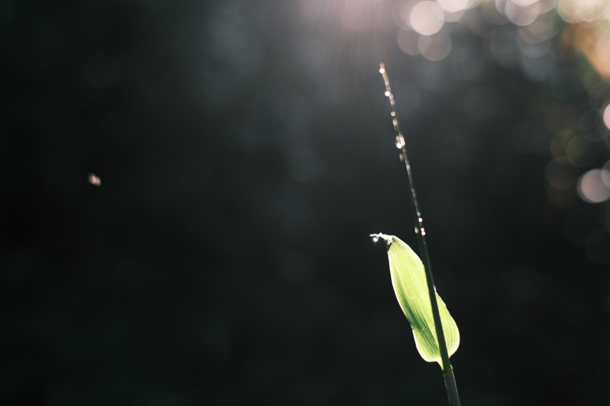 森の木々に朝の光が差し込んでいます。昨夜は雨が降ったのか、あたりは露でしっとり。きらきら光る木の葉や雫に心惹かれ、しばし足を止めてシャッターを切りました。