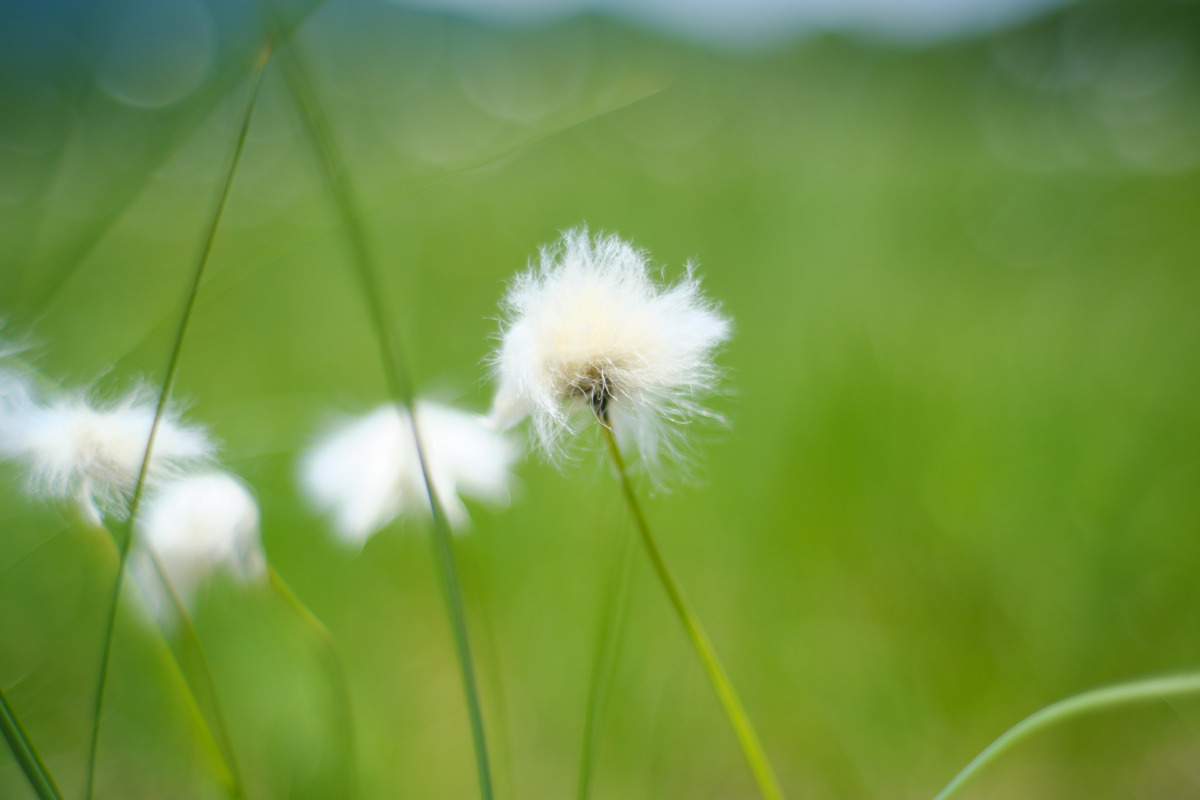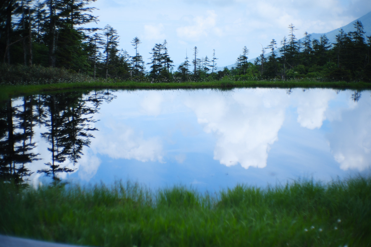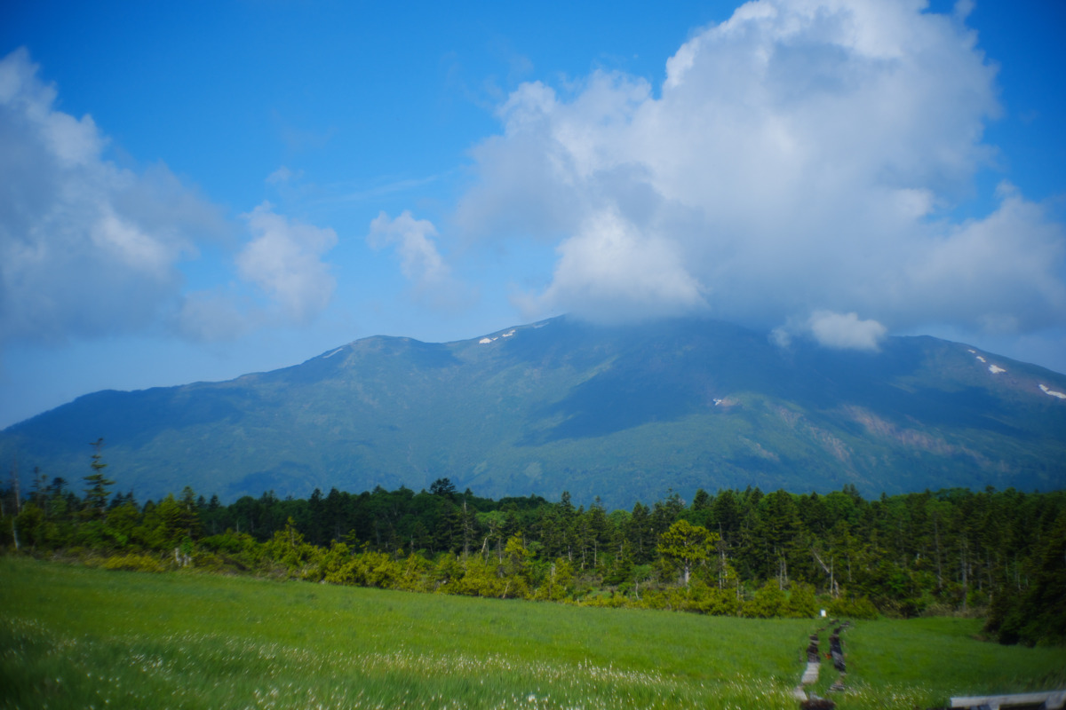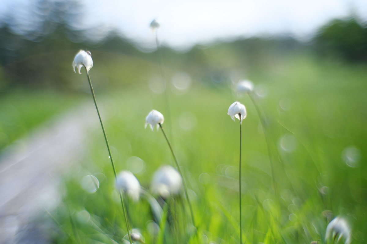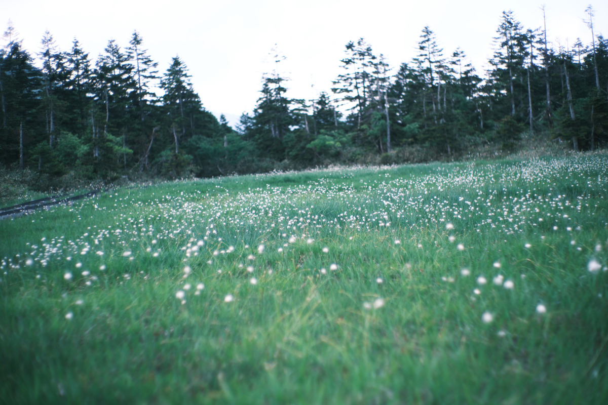 中原山を越え、横田代から1時間ほど歩いてアヤメ平に到着。ワタスゲの白い果穂がふわふわと揺れています。だれもいないのを良いことに、木道に寝転び空を仰ぐ。頬の横には白いワタスゲ。見たかった景色、会いたかった花。