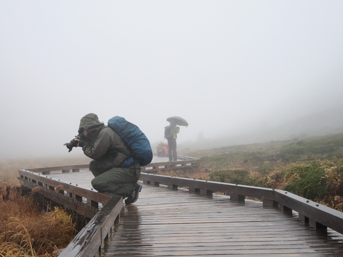 雨の中、お花畑周遊コースにいたのは、宇宙HIKEメンバーの9名だけ。しとしと(時に強く)降る雨と、うっすら漂う霧は、まるで山がまとう天然のフィルター。霧という薄いベールに包まれた世界で、それぞれが心惹かれるものに静かにカメラを向けていきます。