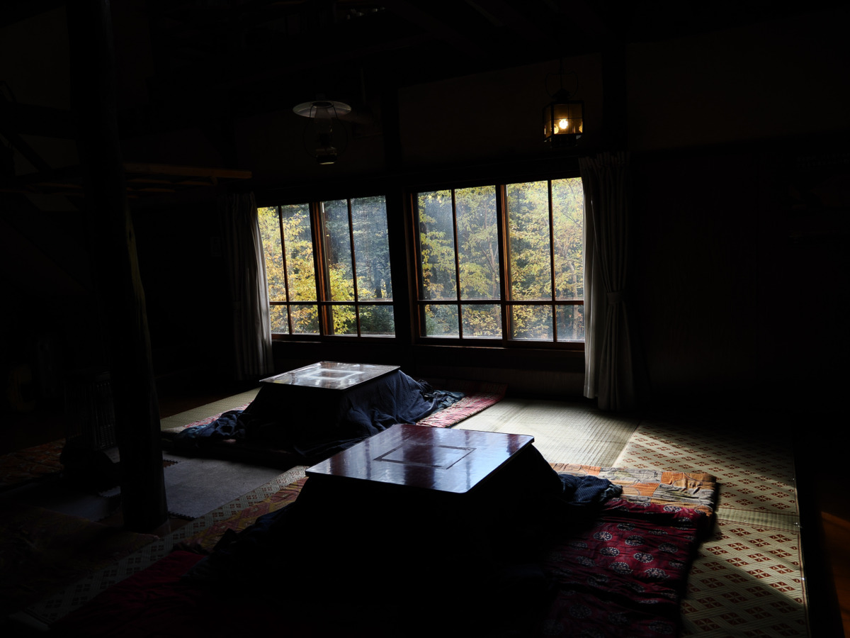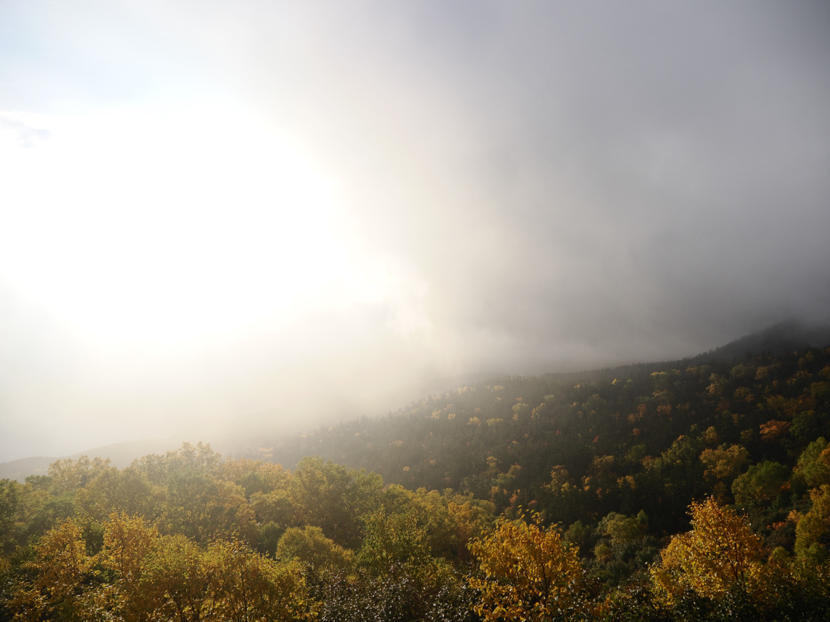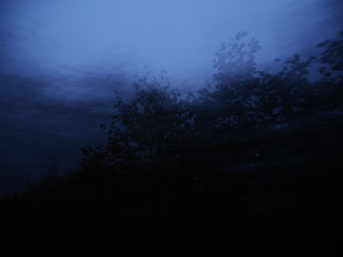 日の出が近づくと、厚い雲を抜けてきた光があたりを深い海のような色に染めました。黒く浮かび上がる木々。強い風にうねりながら流されていく雲。空も、山も、刻一刻と表情を変えていきます。