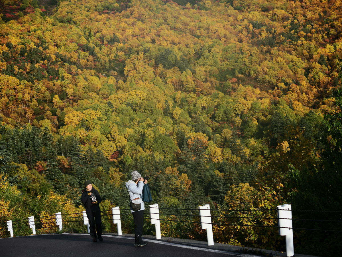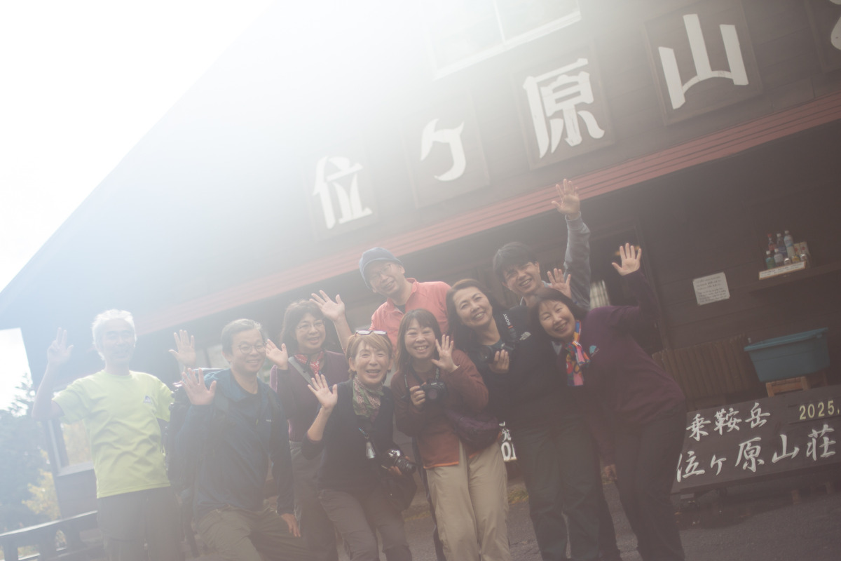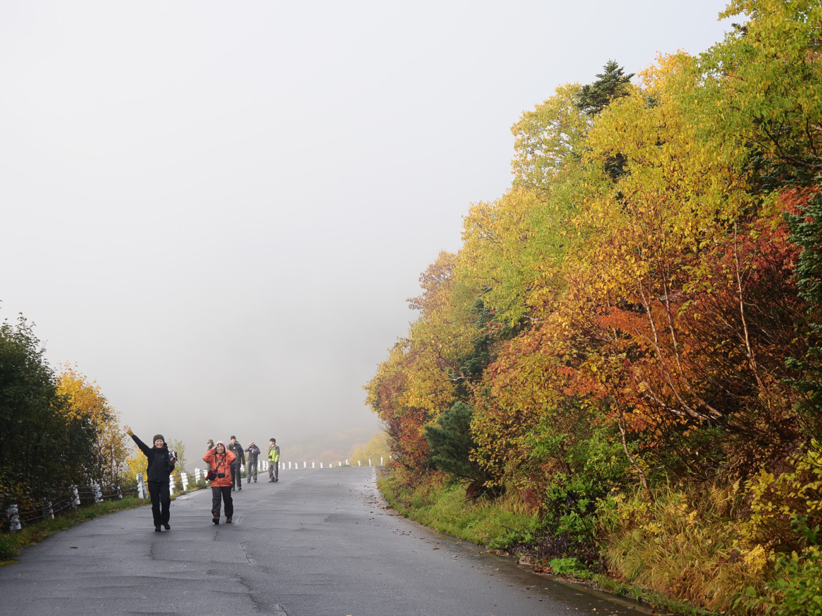ガードレールの向こう、眼下に広がる森の上に光が踊り、その下にだけ鮮やかな秋の色が現れました。目の前がまるで劇場のよう。毎日訪れる朝だけれど、私たちにとっては “乗鞍岳が見せてくれた特別な朝” 。カメラを持つ手がみんな忙しそう!晴れ間と紅葉、雨避けフードを外した瞬間に見せた全員の笑顔が、とても印象的でした。