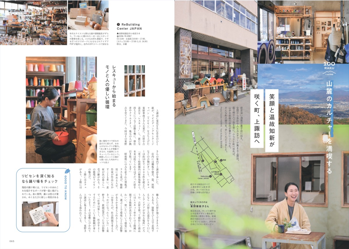 ▲霧ヶ峰や八ヶ岳のふもとに広がる上諏訪は、山とともに暮らす人が集まる町。古道具を扱う店「リビルディングセンタージャパン」を拠点にして、オーナーの東野華南子さんが町の魅力を案内します。山歩きの前後に立ち寄りたくなる店や居場所がたくさんあり、いまにでも上諏訪に足を運びたくなること間違いなしです。