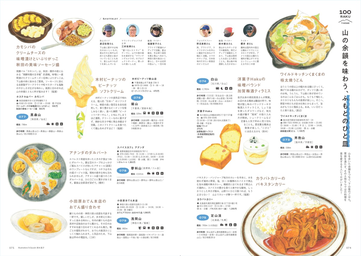 ▲山を歩いたあとに味わう、その土地ならではのごはん。今回は、ライターや編集者、登山ガイドなど、山をよく知る人たちに「下山後に立ち寄りたいお店のひと皿」を教えてもらいました。その土地だからこそ出合える料理や、体を動かしたあとに味わいたくなるスイーツをたっぷりと紹介します。
