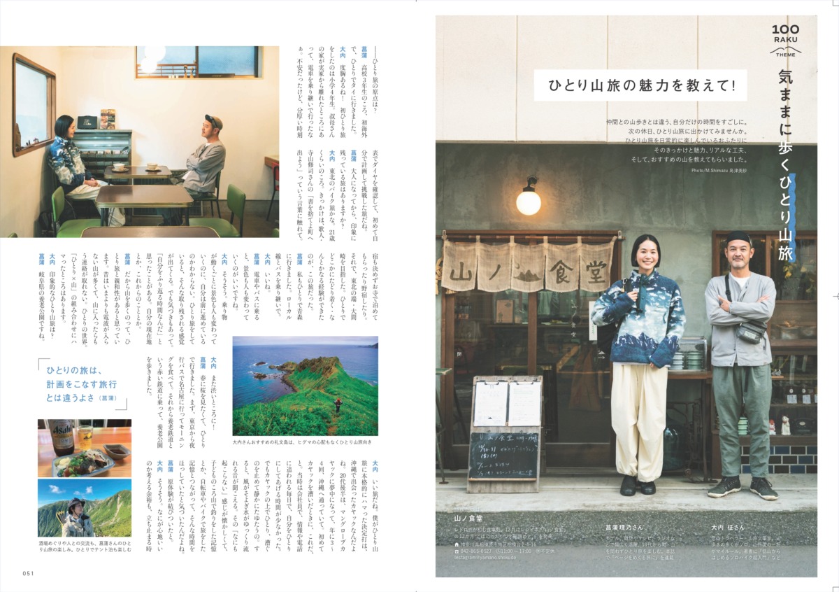 ▲ひとり山旅を日常的に楽しんでいる、モデルの菖蒲理乃さんと低山トラベラー・山旅文筆家の大内征さん。そんなふたりが、それぞれの体験やひとりで山を歩く理由、気ままな旅の魅力についてを語り合います。計画通りに進まないからこそ生まれる余白が、自分自身と向き合う時間をつくってくれるのだとか。ひとり山旅に挑戦してみたい方は要チェックです。