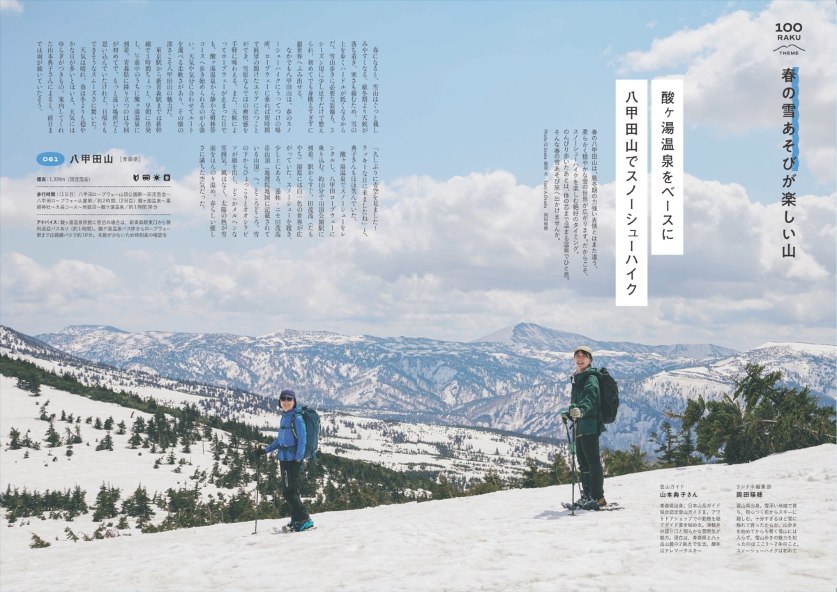 ▲春の八甲田山で楽しむ、のんびりとしたスノーシューハイク。案内役は、地元に拠点を置く登山ガイドの山本典子さんです。雪の上を自由に歩く爽快感を味わったあと、山を下りたらすぐに温泉へ浸かれるぜいたくなプラン。ここでは雪あそびと湯治を組み合わせた、大人の山旅を紹介します。