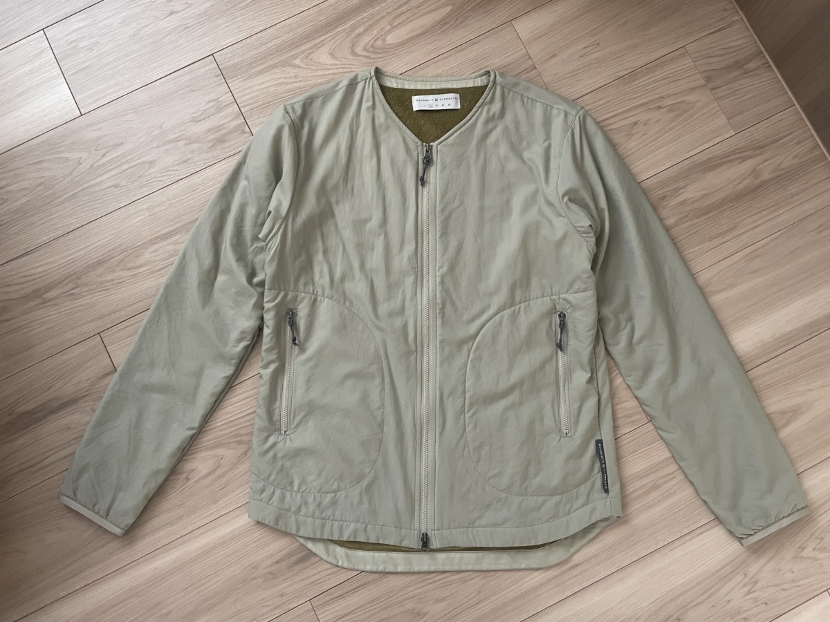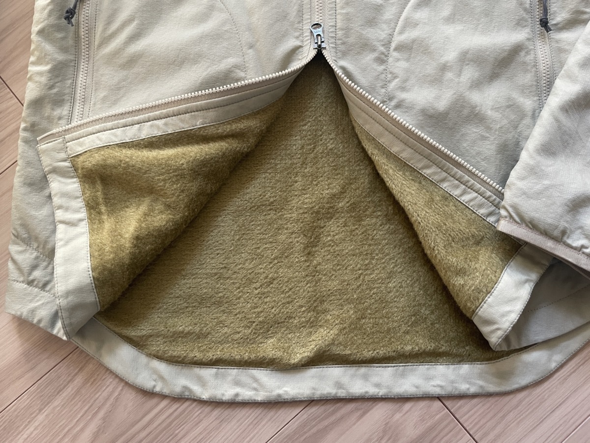裏地に配されているポリエステル素材・オクタは、軽量かつ、吸湿速乾性、通気性、保温性に優れる。ハイイロとグリーンの配色、ラウンドネックも好み。ダブルジップ仕様で、裾からさっと開けられるのもうれしいポイント。