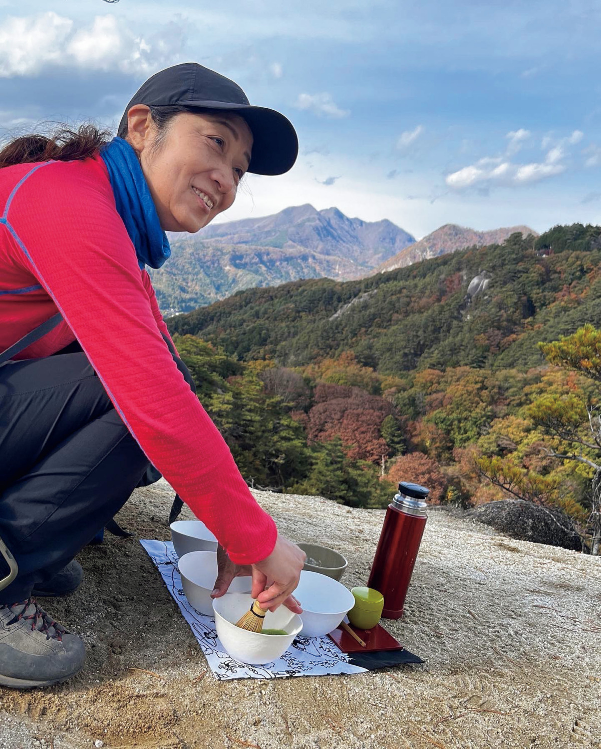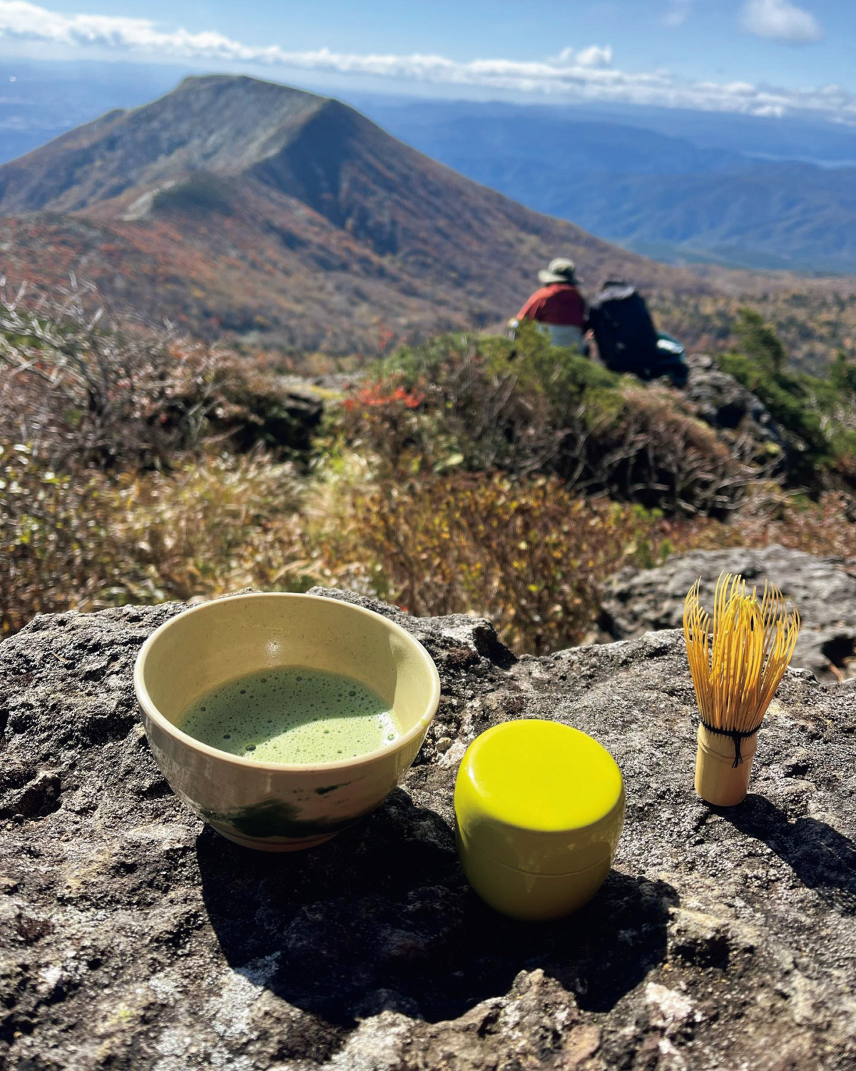 「茶室での茶道はすごく集中できます。山ではそのよさを活かしつつ、もっとワイワイ。行動食をげて、みんなでシャカシャカと点ててにぎやかに楽しみます」