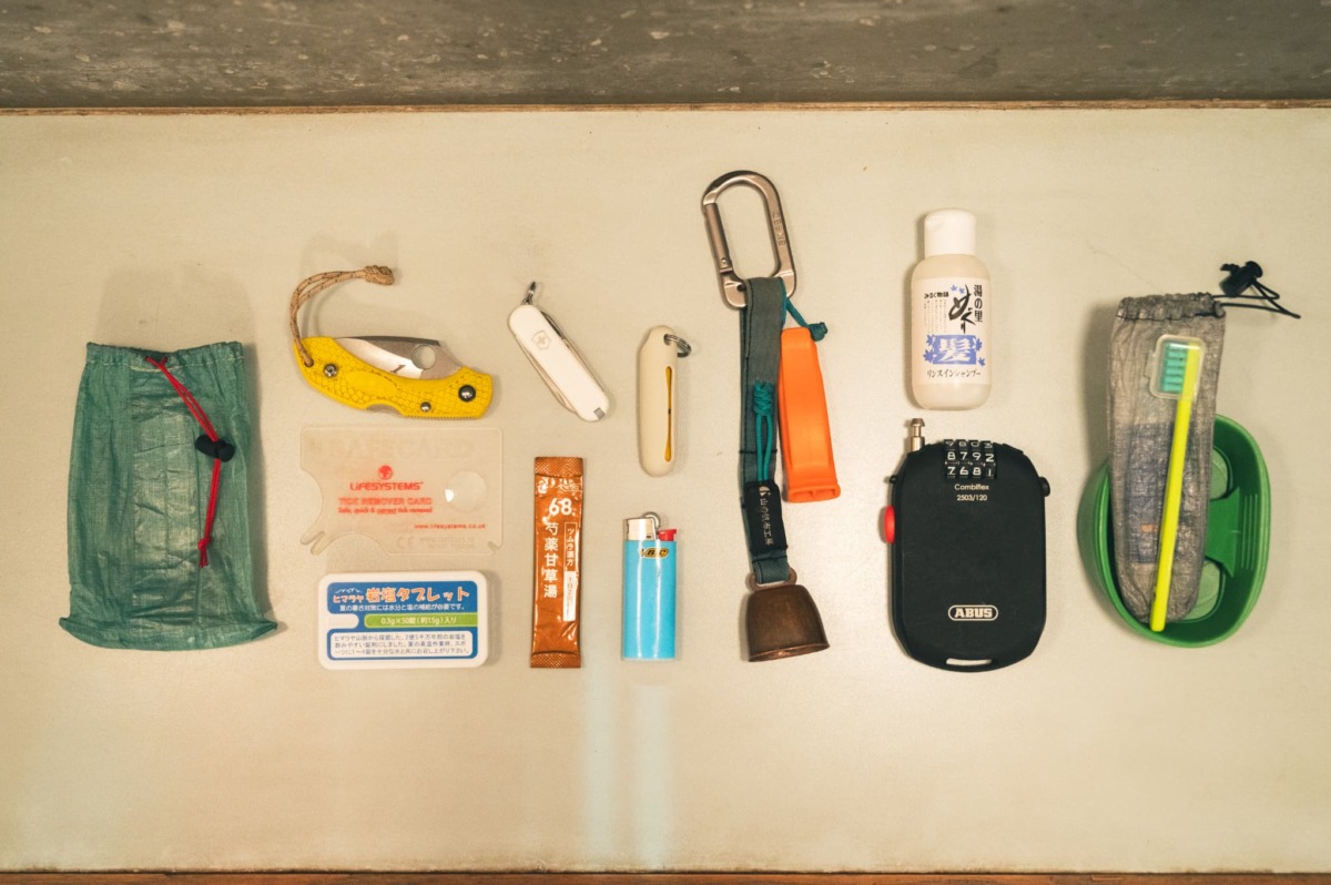 シャンプーだけで全身を洗う。石鹸を置かない温泉は意外と多い。耳栓は睡眠の質を上げつつアラームは聞こえるのが便利。ほかにデポ用コードロックやクマ鈴、ホイッスル、塩タブレットなどを携帯。