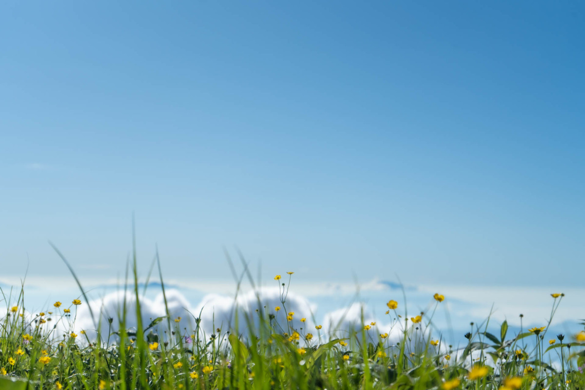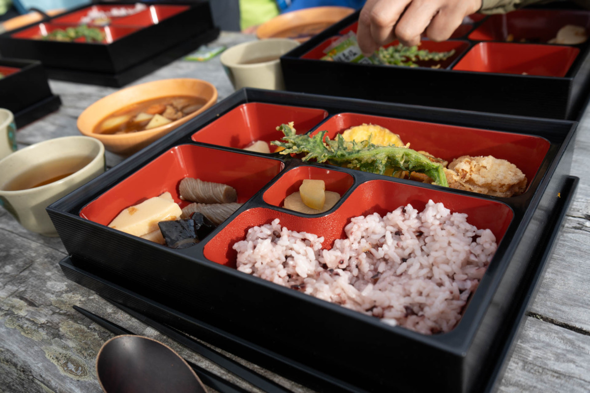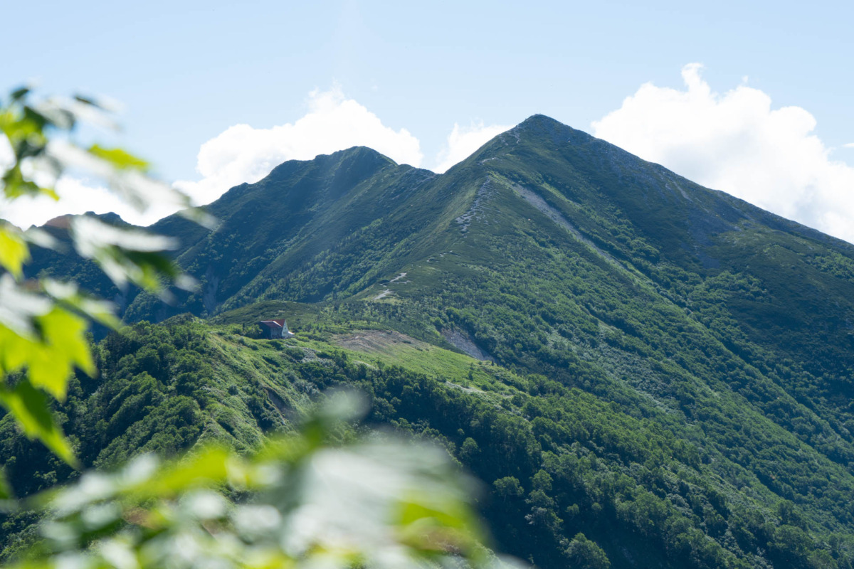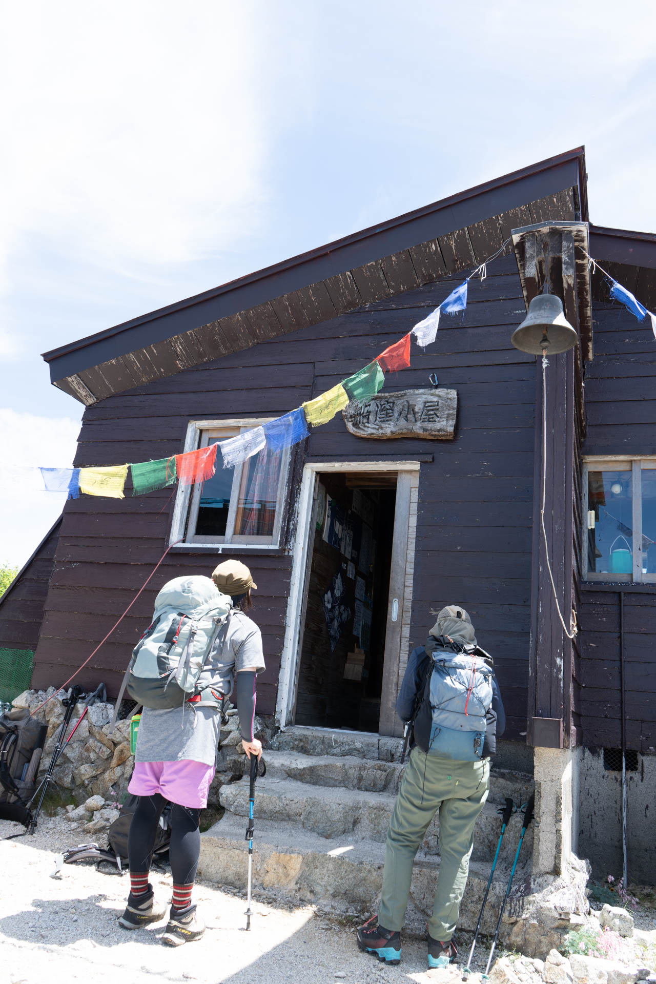 稜線まで登り切ると、ポツンと佇むカラフルなフラッグが目印の小さな小屋が待っていてくれた。