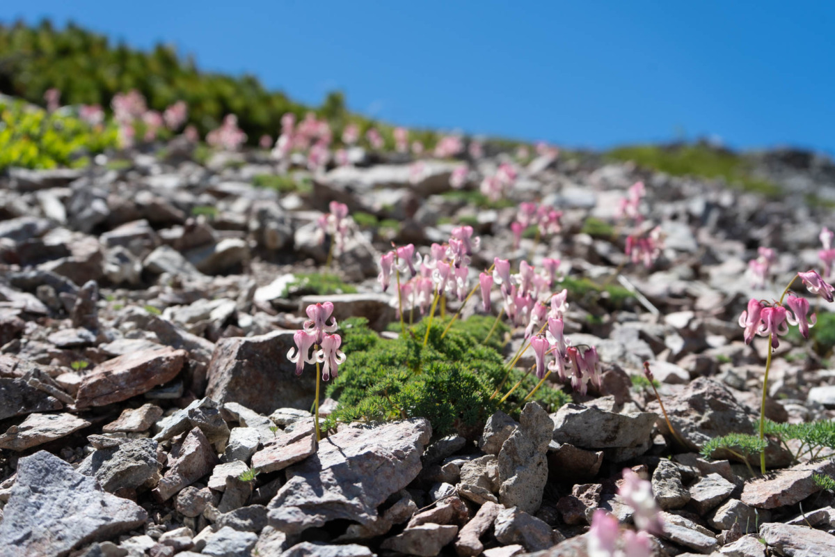 初夏の時期は1年の中でも一番お花に会える。とくに今年はコマクサの当たり年だったようだ。蓮華岳山頂付近では満開のコマクサで淡いピンク色に染まっていた。