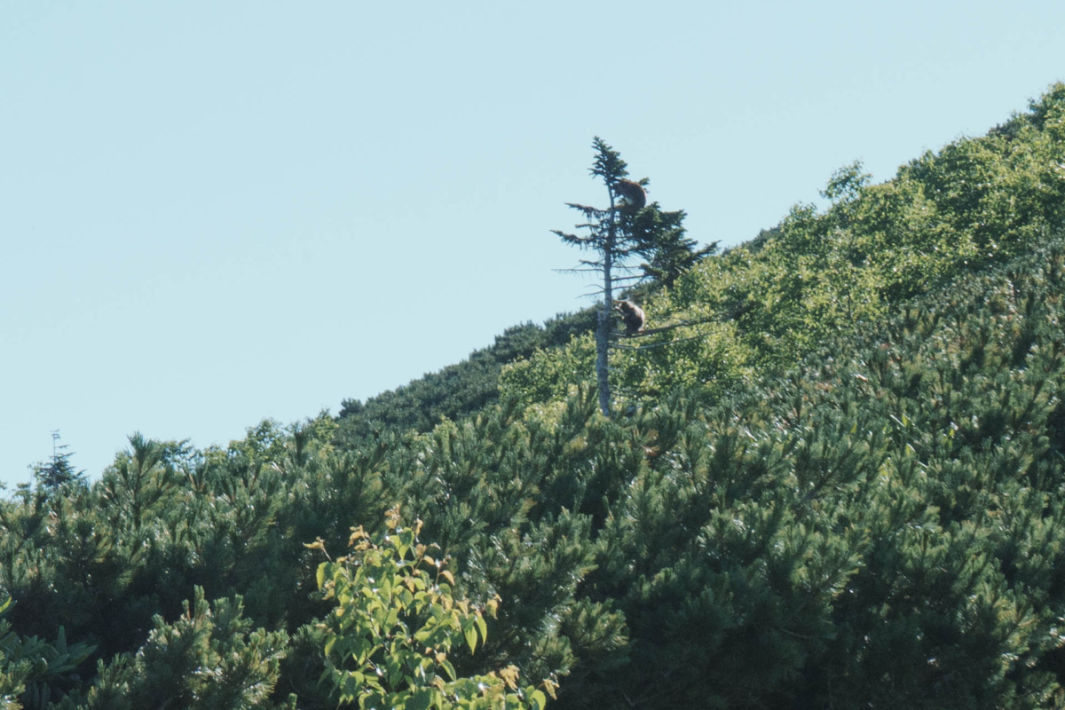 一番前を歩いていた私は樹林帯に差し掛かっていたため、熊の姿を確認出来なかった。見通しの良いところまで戻って、仲間の指指す方向を見ると、3つの黒い塊が木を登っていた。どうしよう……しばらく停滞だ。