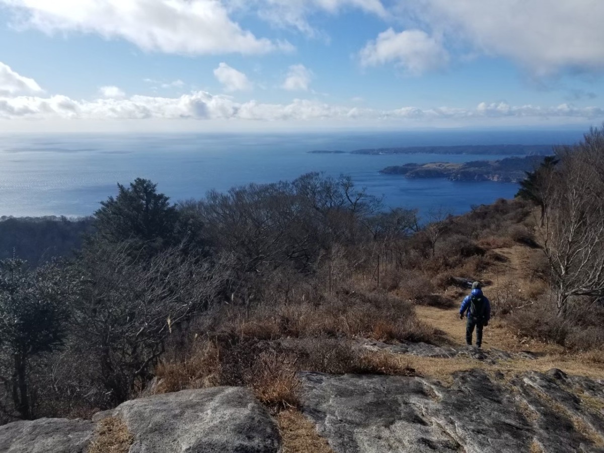 ▲みちのく潮風トレイルルートにもなっている金華山。山頂付近の景色は最高
