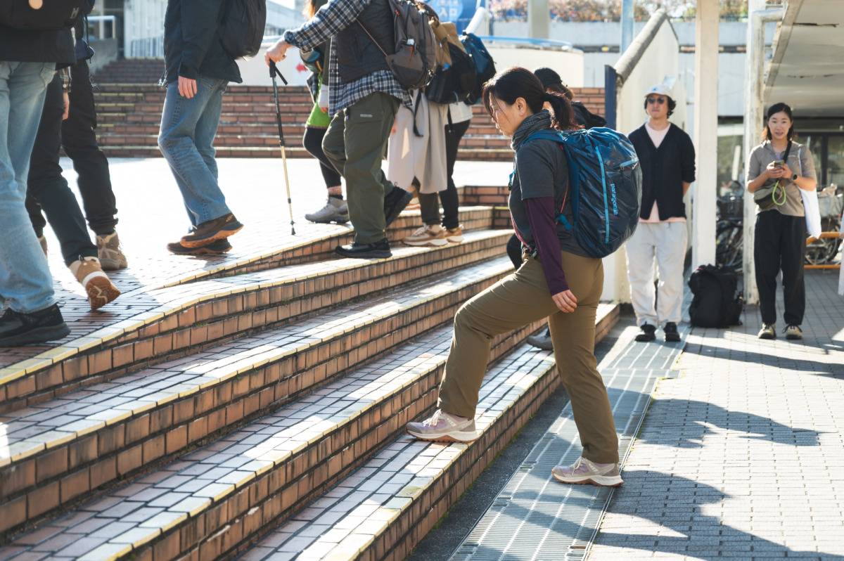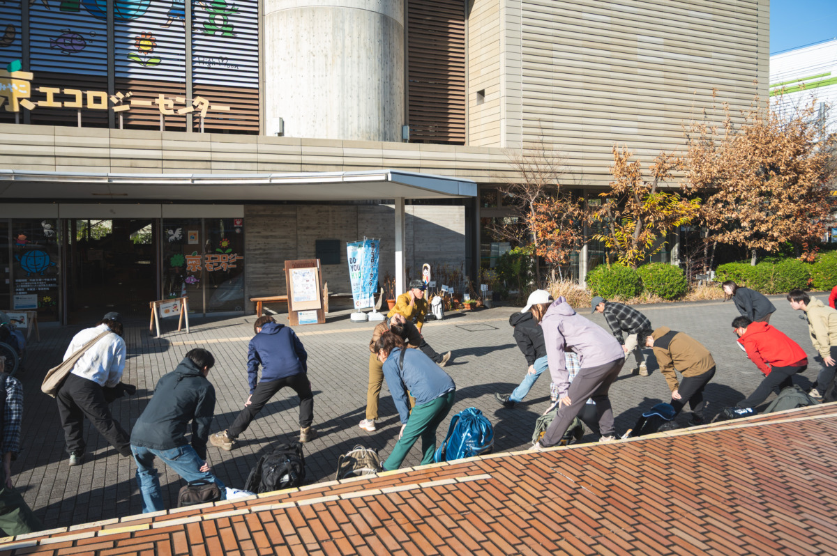 Miyuuさんとともに、「Kyoto × Miyuu」の舞台を自分の足でたどる今回のスタート場所は「京エコロジーセンター」。自己紹介や準備体操をすませ、足に負担のかからない階段の上り下りの仕方や、疲れにくいバックパックの背負い方をガイドさんと確認。足元を整えたら、いよいよ歩き出しです。