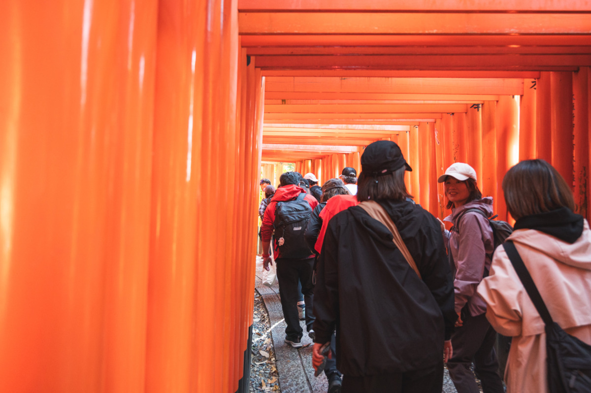 まずは、伏見稲荷大社へと続く参道へ。朱色の鳥居が幾重にも連なる景色は、まさに京都を象徴する風景。朝の清々しい空気のなか、奥へ進むにつれて、街の喧騒が遠のき、静けさが広がっていきます。