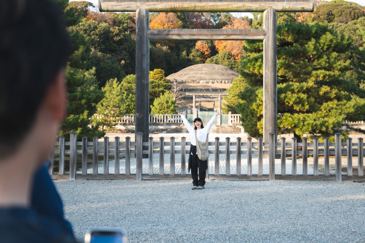 パノラマを堪能しながらお昼ごはんを食べたあとは、明治天皇が眠る広大な桃山御陵へ。ここは、「Kyoto × Miyuu vol.9」でも印象的な場所。画面越しに見ていた景色が、目の前にある。おなじ映像を見て、おなじ道を歩いてきたからこそ生まれる、一体感のある時間でした。