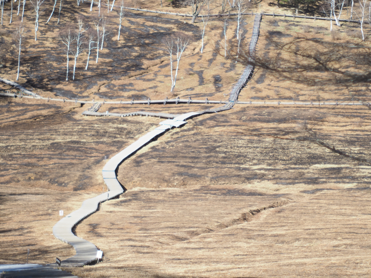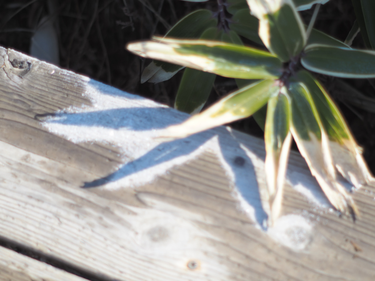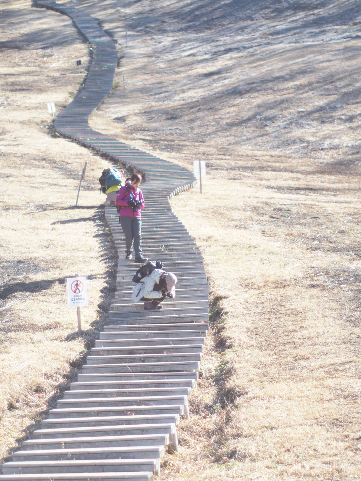 入笠山には数回行っていますが、こんなことは初めてです。世界の中心にいるかのごとく、湿原の中心で愛を叫びたくなりそうですが、それは心の中で留め、愛を叫んでいる気分で気持ちよく階段を降りて行きます。すると早朝ではないのにも関わらず、まだ残っていました、霜が。