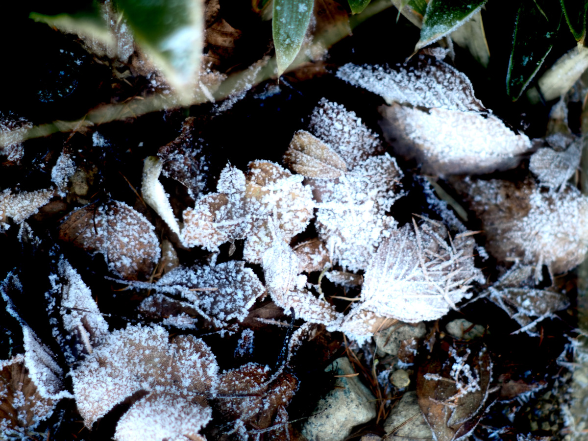 最初は、葉っぱの影になっているところだけに霜が残っているのかと思いましたが、階段を降り進むとびっしりとついていました。
