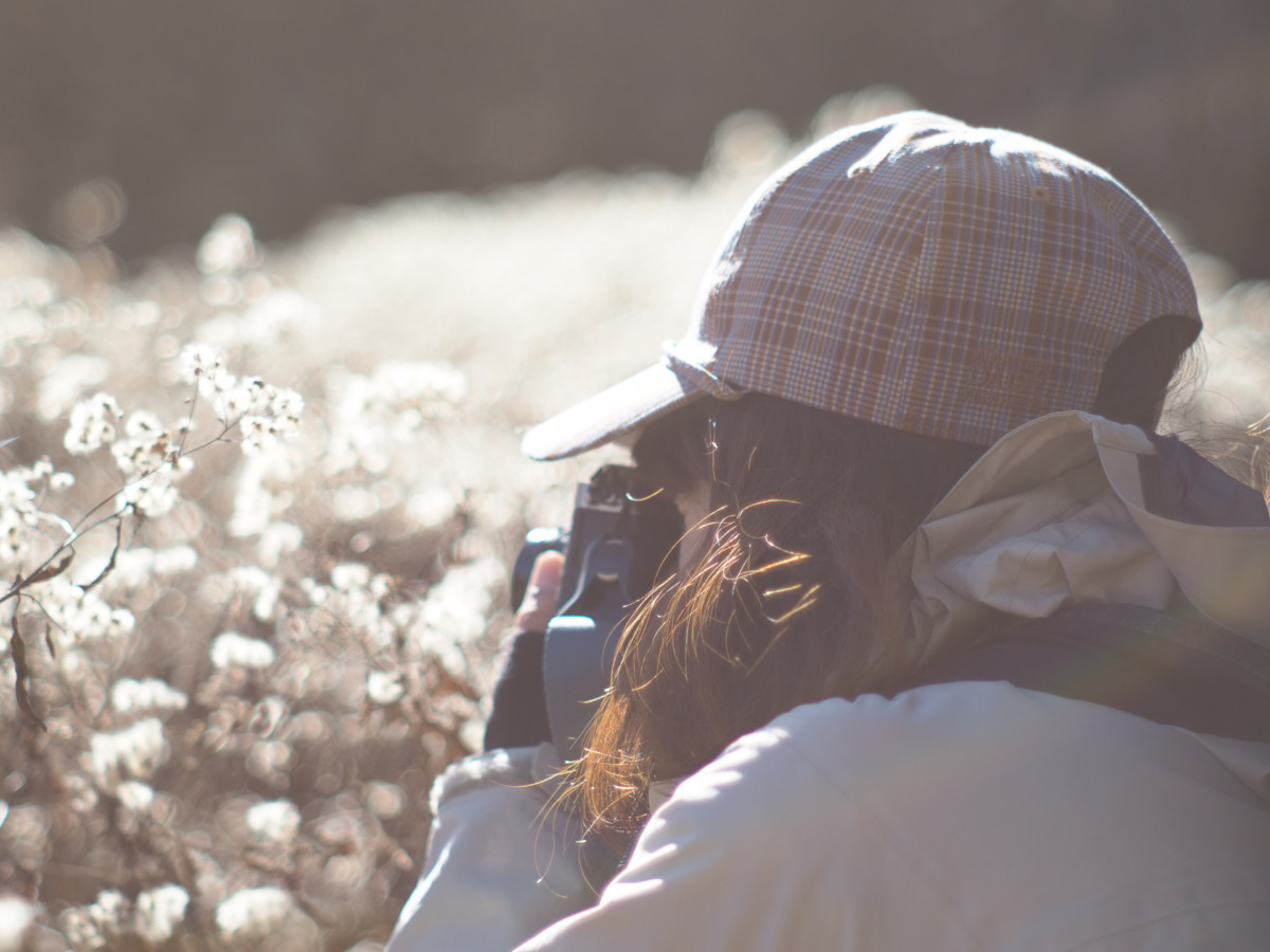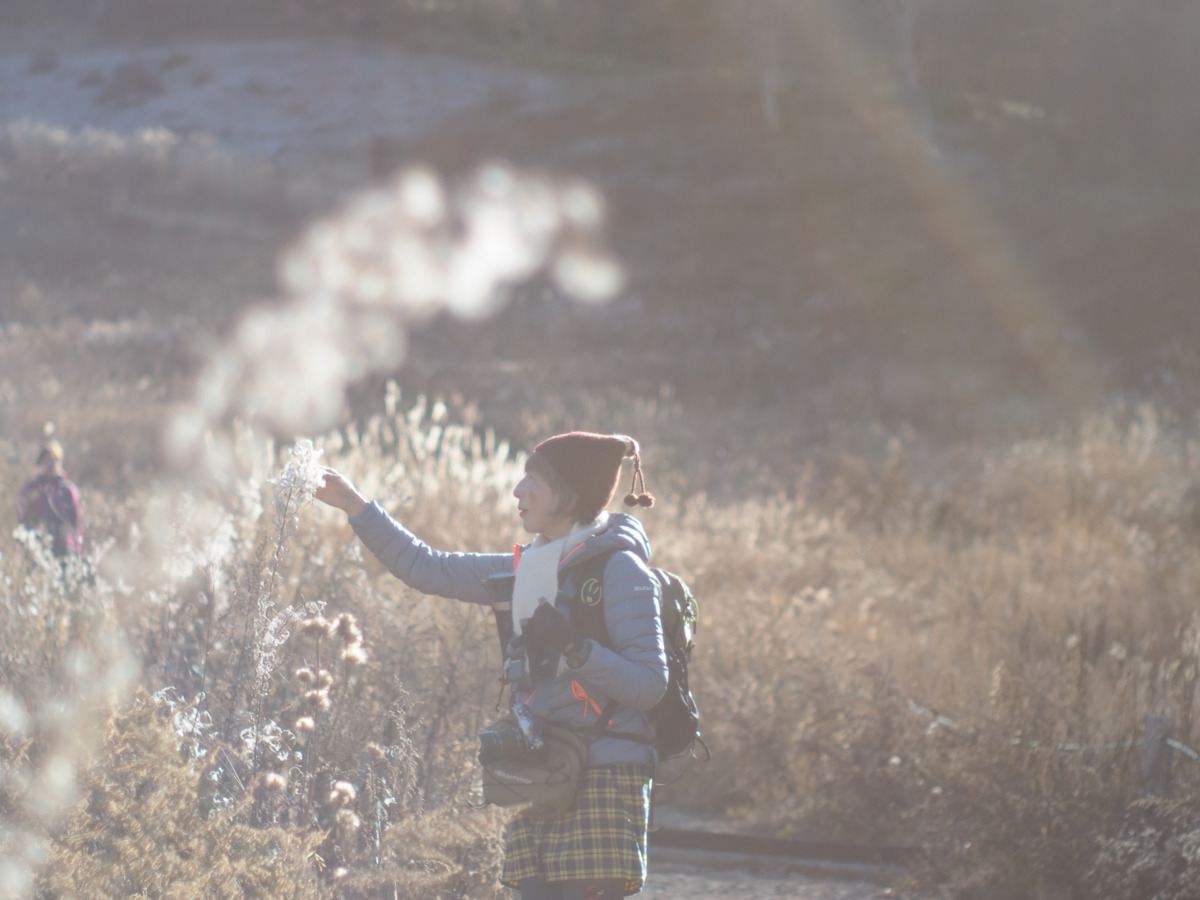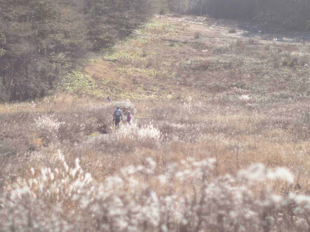 お昼ごはんを簡単に済ませ、山頂での撮影も充分楽しみ下山開始。下りでは、登りで通らなかったお花畑の中を進み、存分に撮影を楽しみます。ススキが日の光でキラキラして、撮りたい衝動が掻き立てられます。そして逆光もまたキレイです。