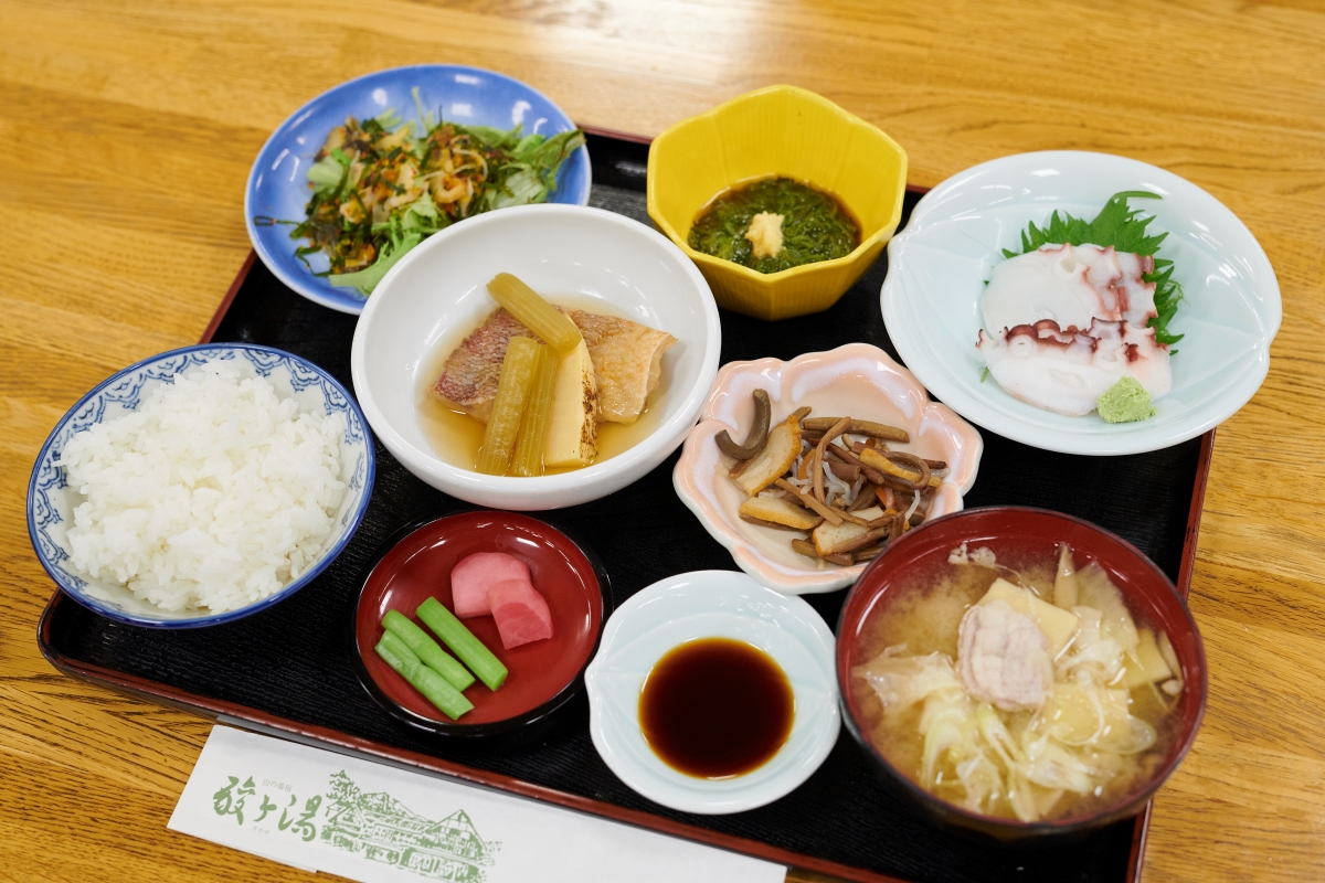 栄養バランスのよい食事が旅の体を優しく整えてくれる。落ち着いた客室は、まだ居たいと思わせる心地よさ。広い売店も併設し、おみやげ選びが楽しい。